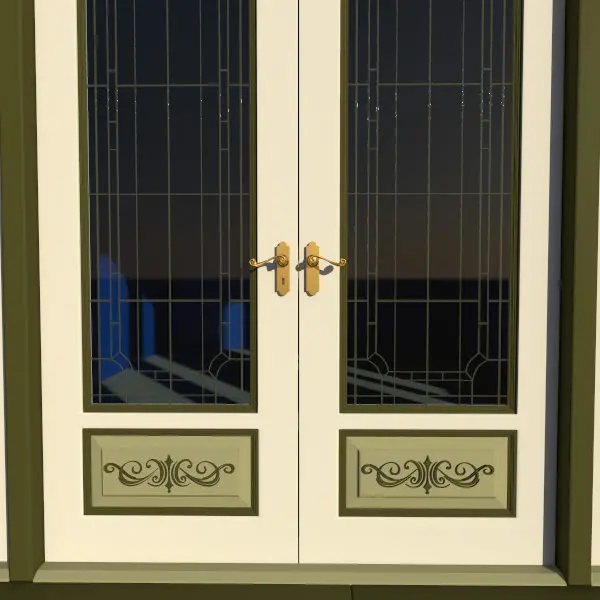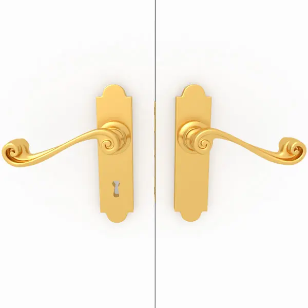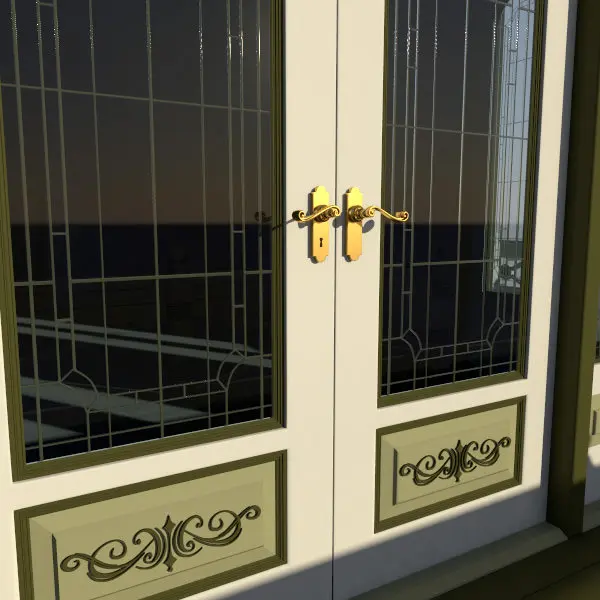 This is a highly detailed 3d model of a double-door handle and lock hardware set.