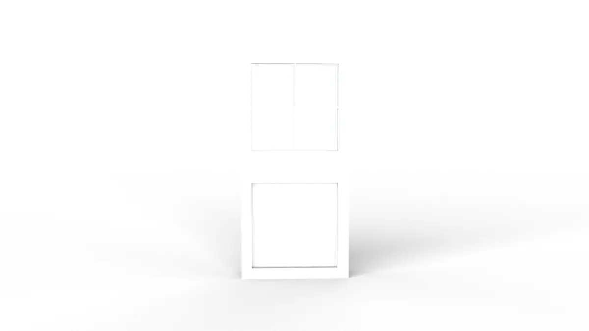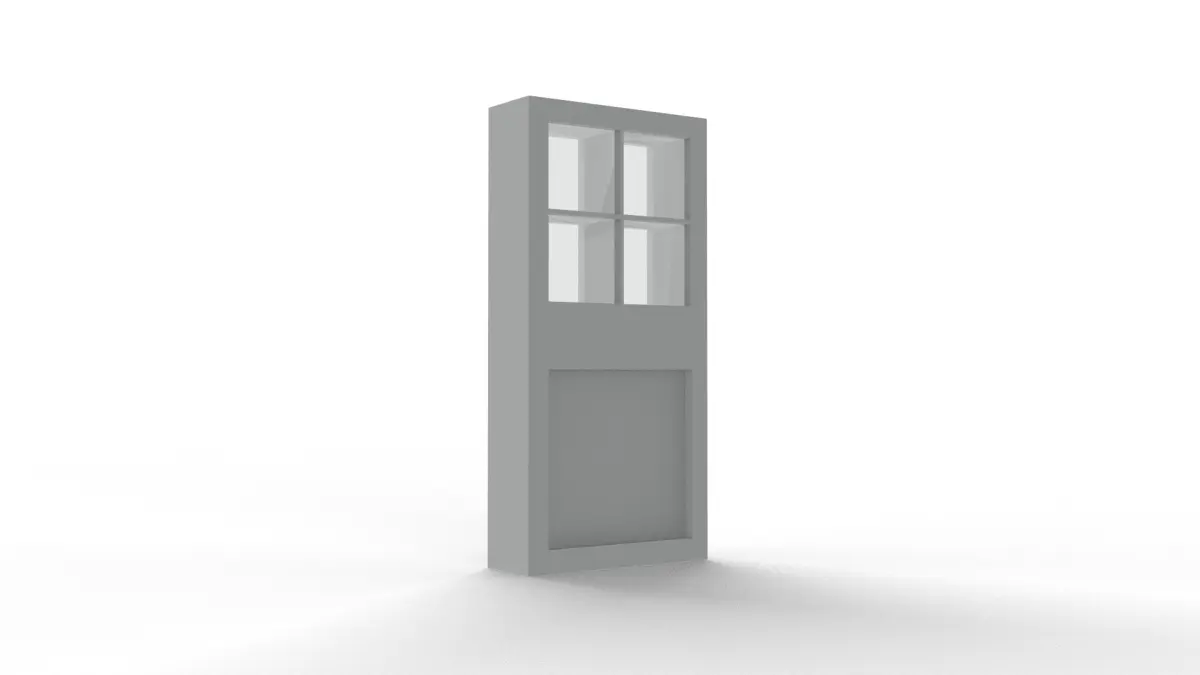 A wooden door with four inset glass panels on top and an inset wood molding on bottom, made double sided