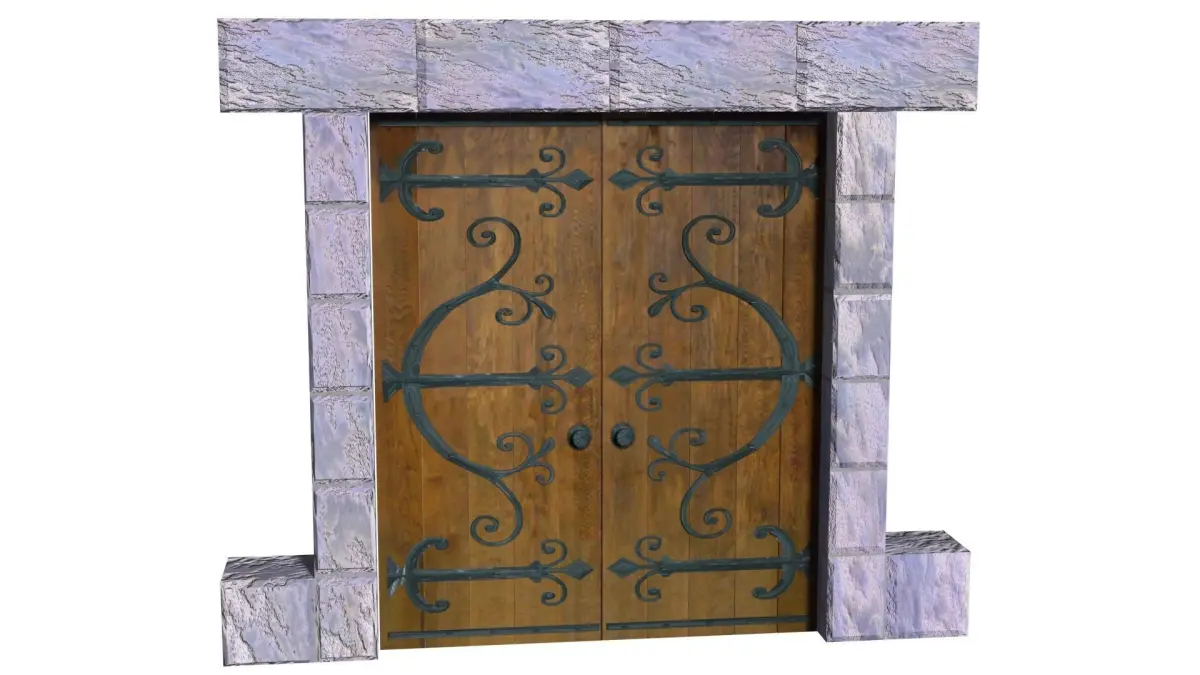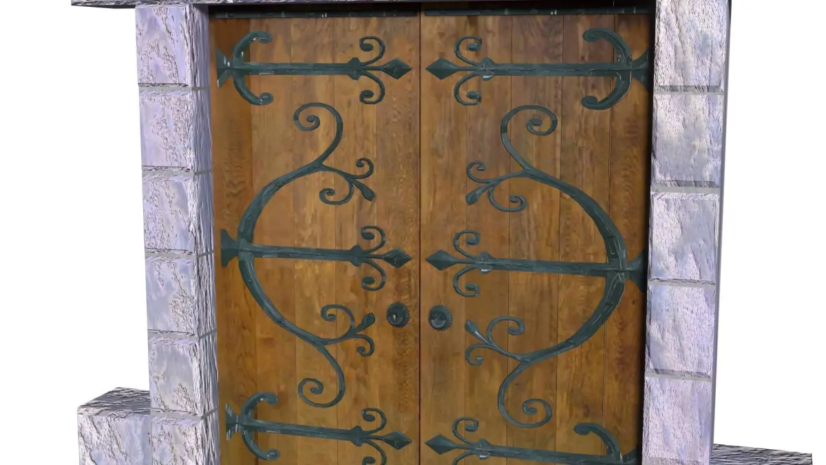 This is a digital 3D model of a wooden door with iron work and framed with stone, created using Blender.
