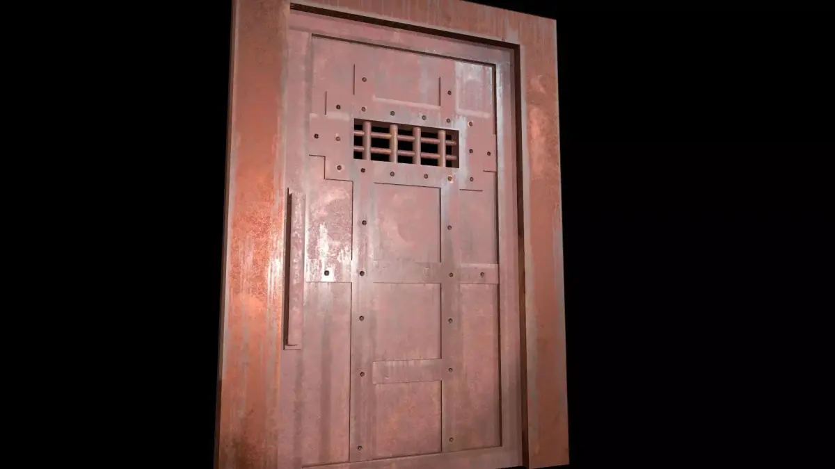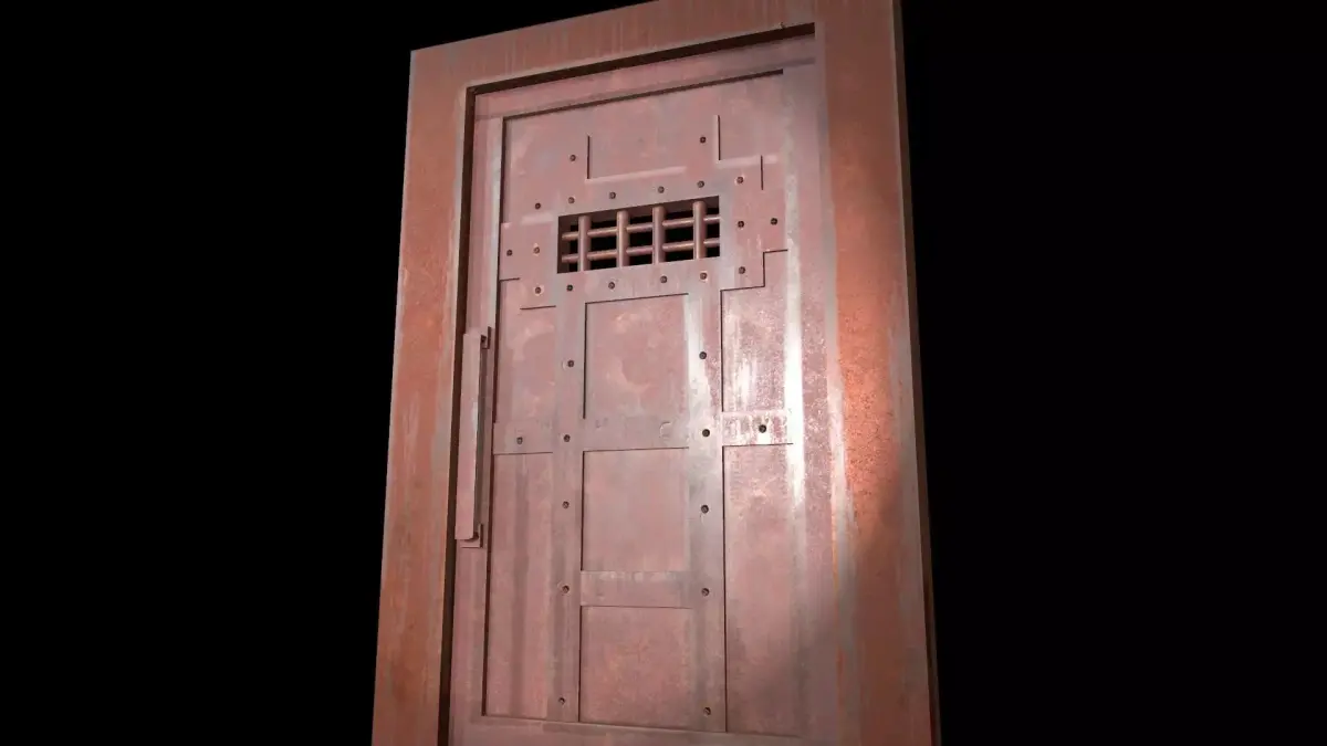 A worn metal prison door. A static object for use in your games. It is not animated.