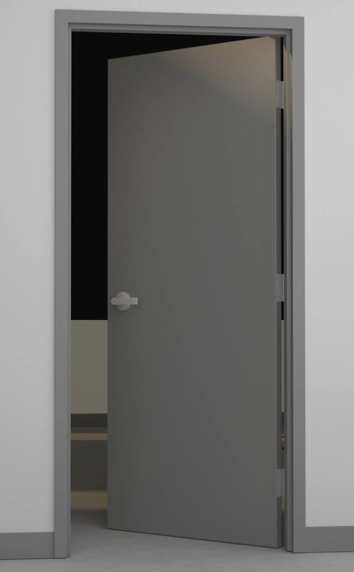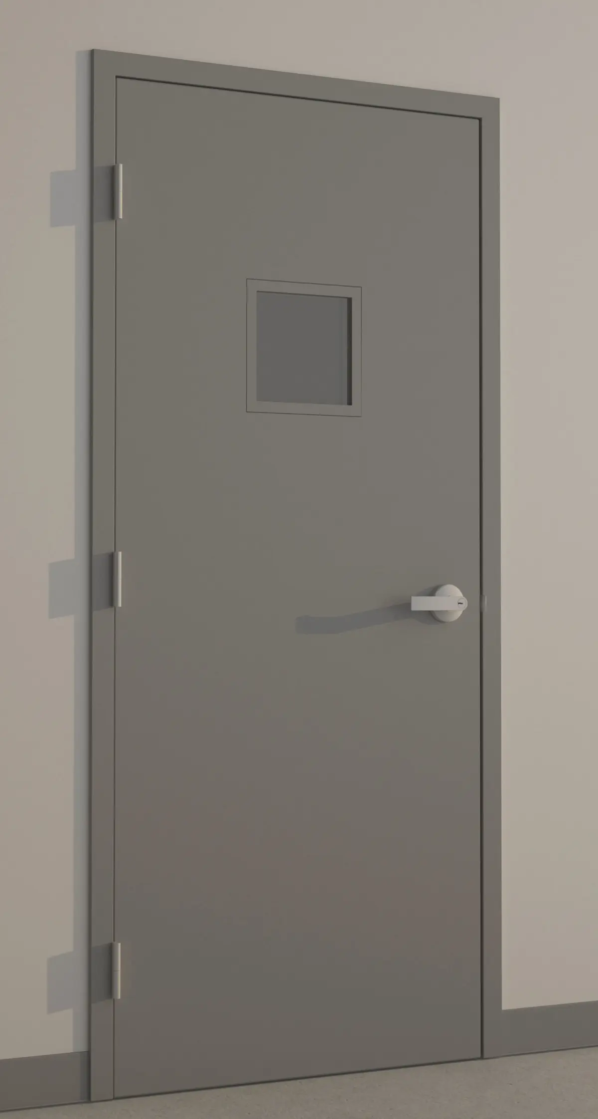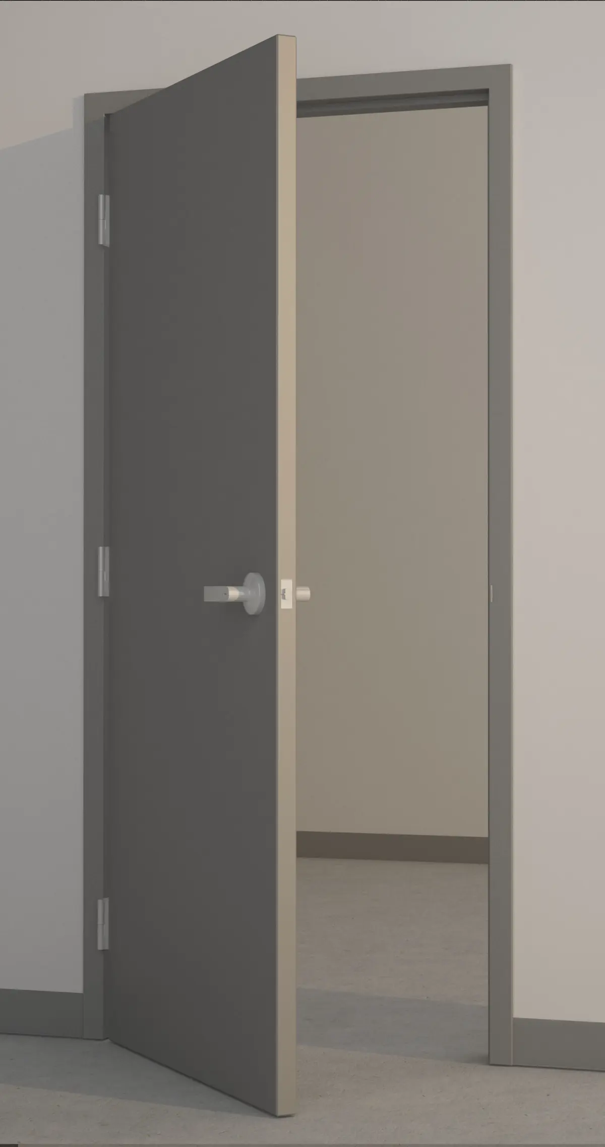 An assortment of doors, hollow metal doors, hollow metal with glass, hollow metal with louvers, doors have pivot on hinges so they can be easily rotated to any angle.