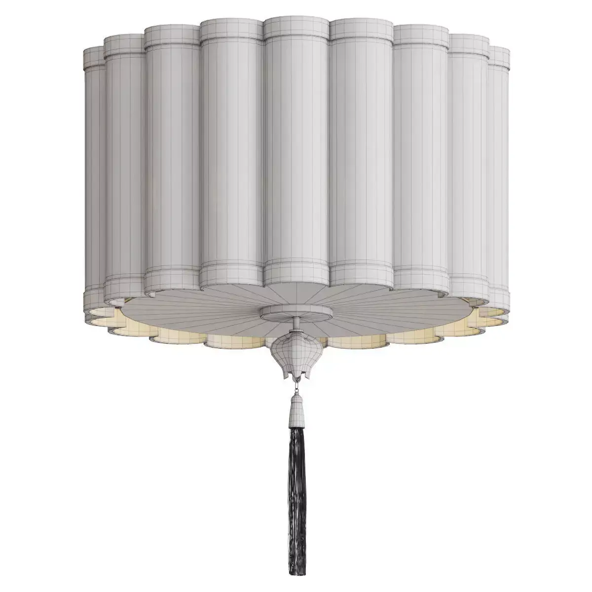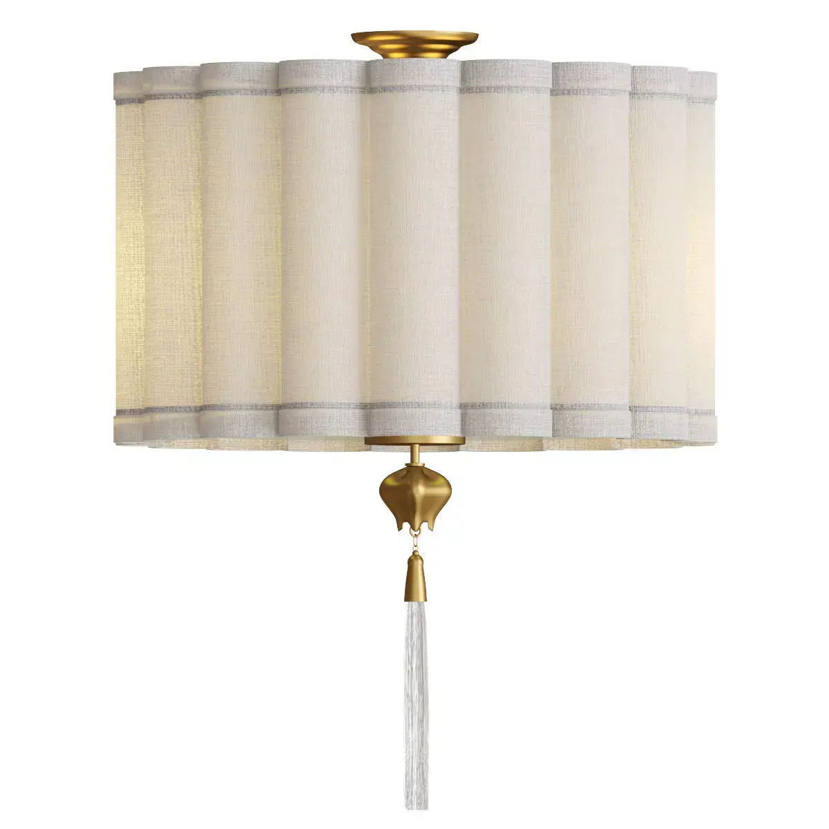 Dorette is an elegant flush mount ceiling light with a soft fabric shade composed of vertical textured panels. The warm textile diffuser creates cozy, ambient lighting, while the decorative brass accent and crystal tassel add a refined classic touch. This fixture is ideal for bedrooms, living rooms, dining areas, hallways, and boutique interiors. A perfect blend of modern elegance and subtle classic style.