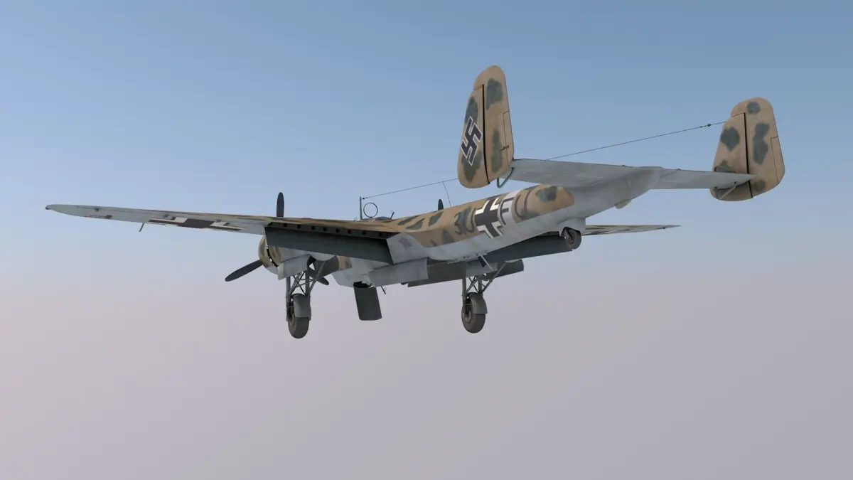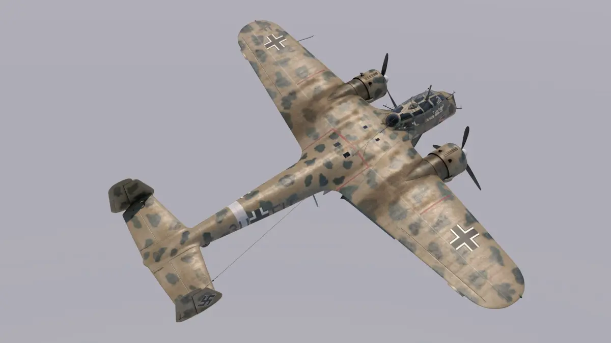 The Dornier Do 17, sometimes referred to as the Fliegender Bleistift (flying pencil), is a light bomber of Nazi Germany during World War II. It was produced by Claudius Dornier's company, Dornier Flugzeugwerke. The aircraft was designed as a Schnellbomber (fast bomber), a light bomber which, in theory, would be so fast that it could outrun defending fighter aircraft. The Dornier was designed with two engines mounted on a shoulder wing structure and possessed a twin tail fin configuration. The type was popular among its crews due to its handling, especially at low altitude, which made the Do 17 harder to hit than other German bombers. Designed in the early 1930s, it was one of the three main Luftwaffe bomber types used in the first three years of the war. The Do 17 made its combat debut in 1937 during the Spanish Civil War, operating in the Condor Legion in various roles. Along with the Heinkel He 111 it was the main bomber type of the German air arm in 1939–1940. The Dornier was used throughout the early war, and saw action in significant numbers in every major campaign theatre as a front line aircraft until the end of 1941, when its effectiveness and usage was curtailed as its bomb load and range were limited. High poly, high detailed 3D model with separate control surfaces, full interior, bomb load and landing gear.