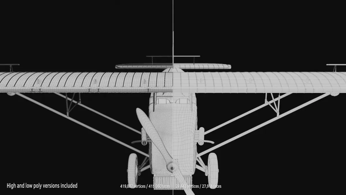 The model consists of eight separate meshes - main fuselage, propeller, 2 x wheels, 2 x ailerons, elevator and rudder - for a total of 419,887 vertices and 415,060 faces. Each object had the appropriate pivot point for easy animation.