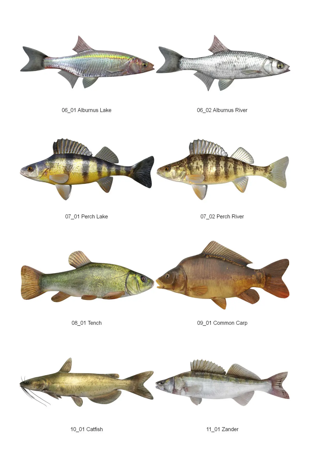 20 very detailed and completely textured 3D-models of fishes: Pike, roach, sea bream, porgies, crucian carp, silver Prussian carp, European conger, European eel, alburnus, European bass, perch, tench, doctor fish, common carp, catfish, zander, salmon, trout, stingray, mackerel, swordfish, flounder, tuna, shark, garfish.