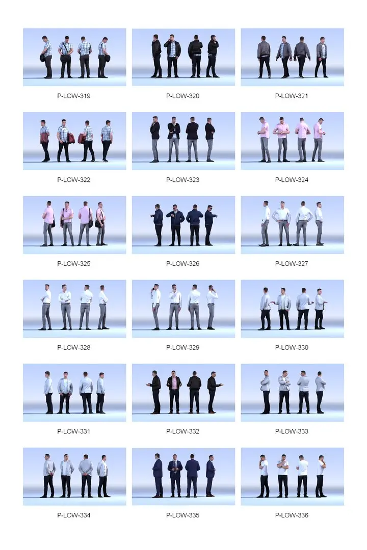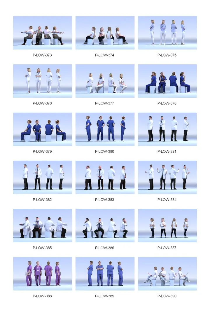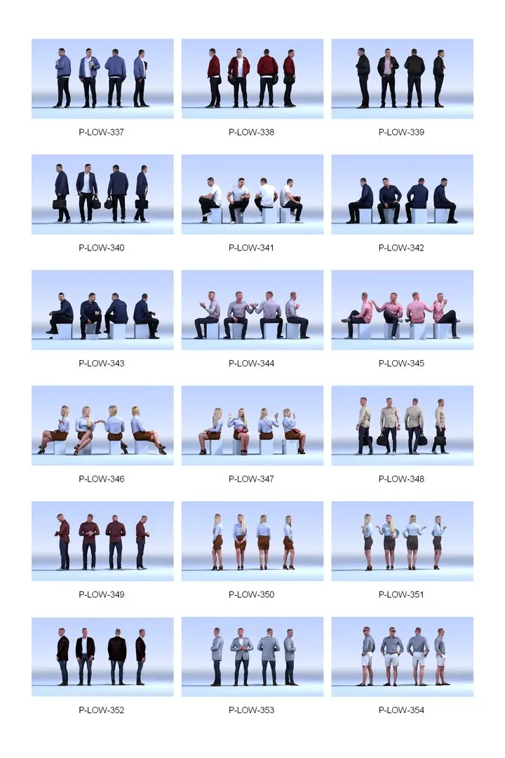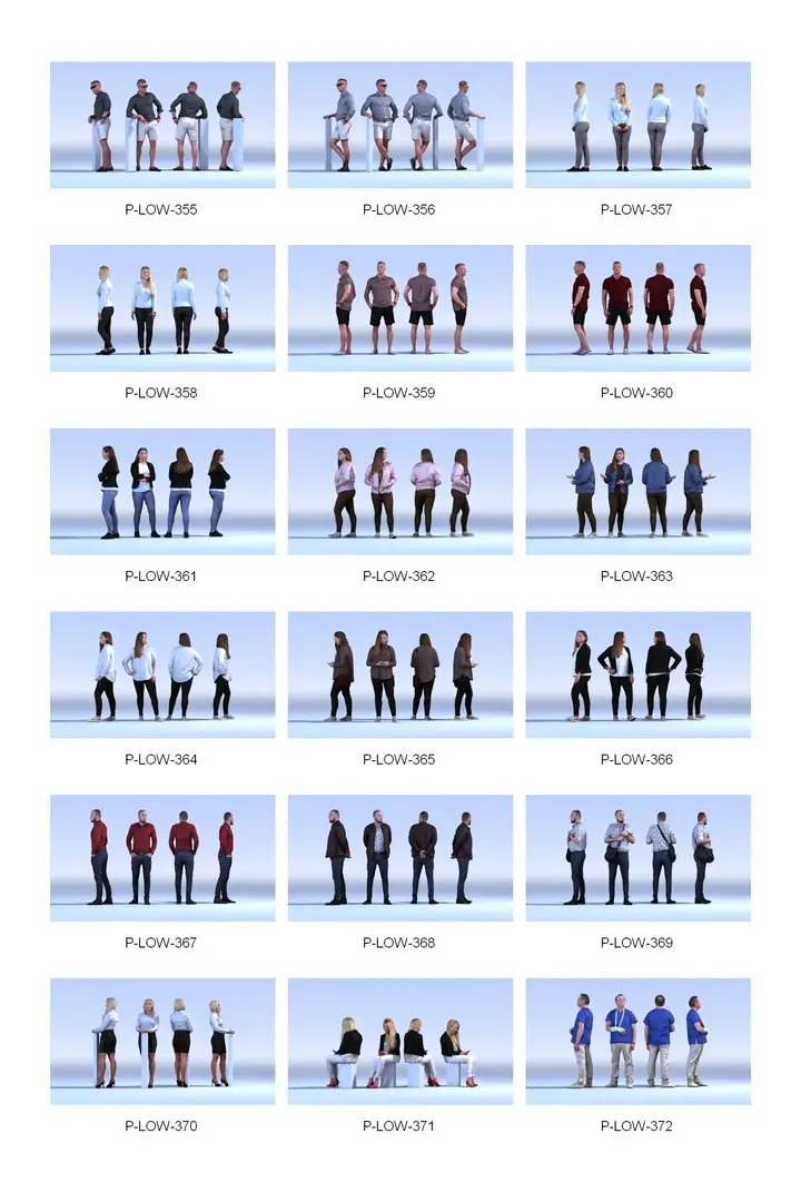 The product DOSCH 3D: Lo-Poly People Vol. 4 contains 100 fully textured lo-poly 3D-models (10,000 polygons per 3D-model) of photo-real people in various poses.