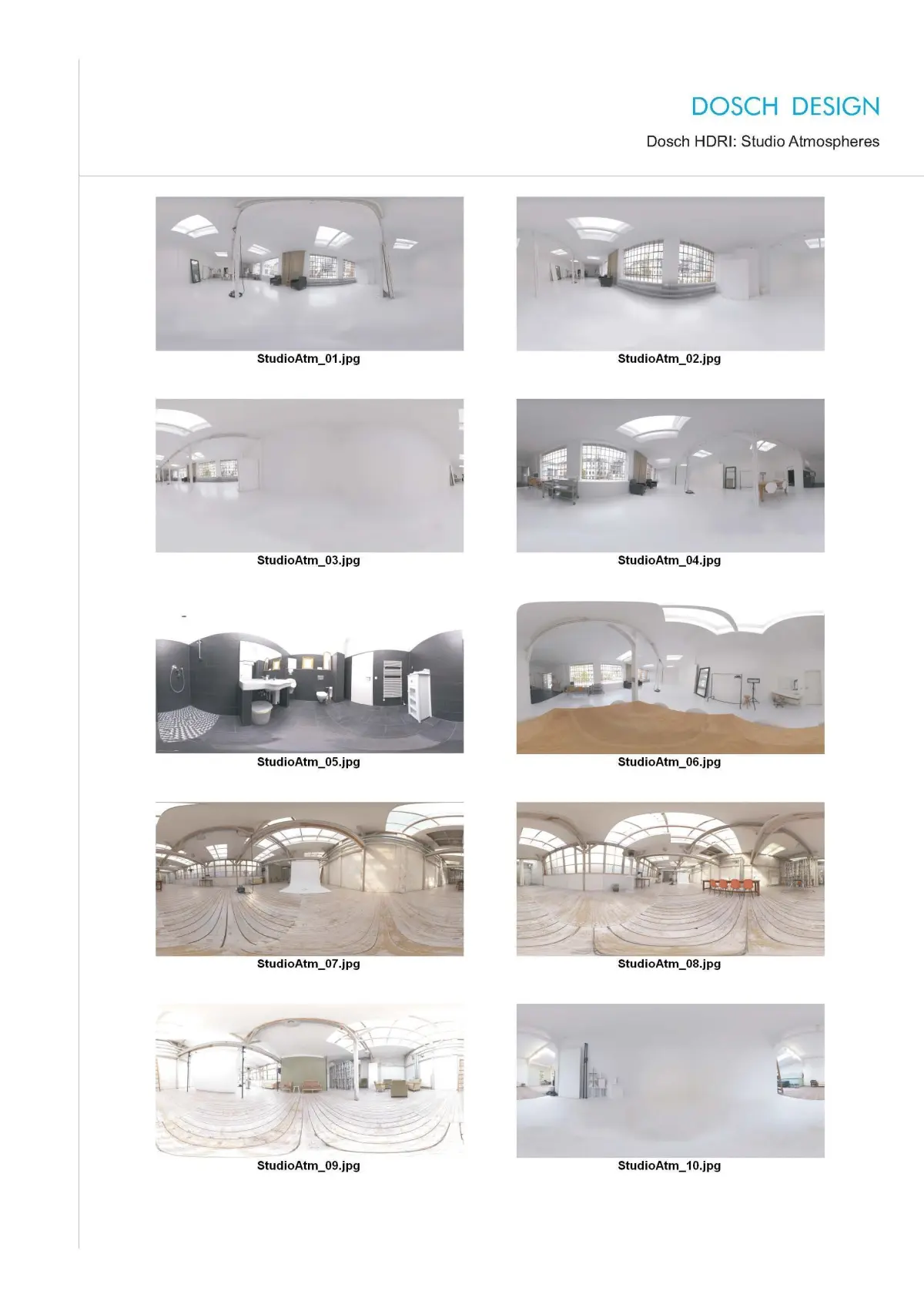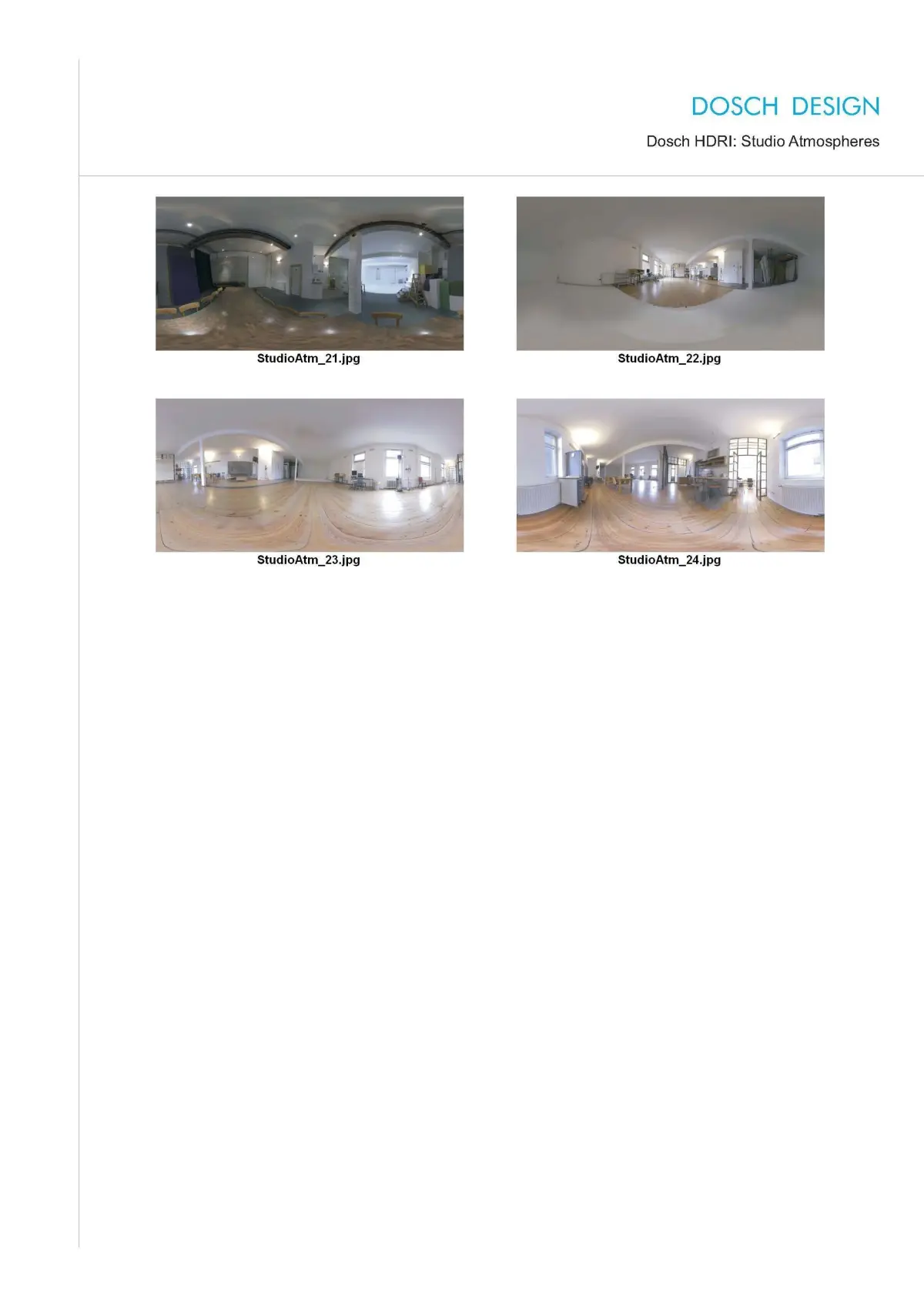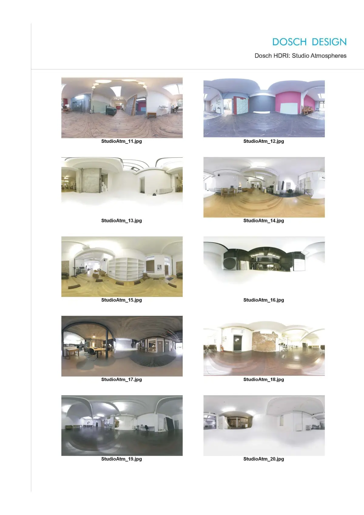 Dosch HDRI: Studio Atmospheres offers an exceptional collection of 24 High Dynamic Range Images that provide a vast set of photo studios' ambiance.Spherical Map - 10,000 x 5,000, 6248x3124, 2048x1024 pixel