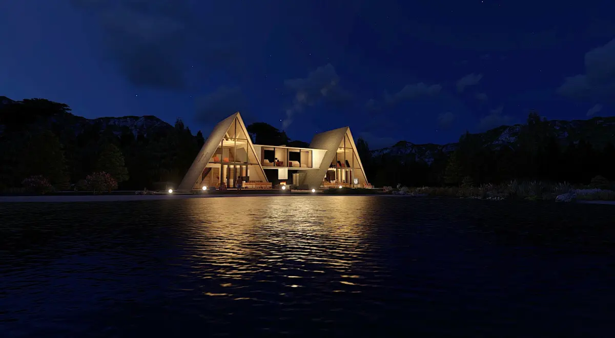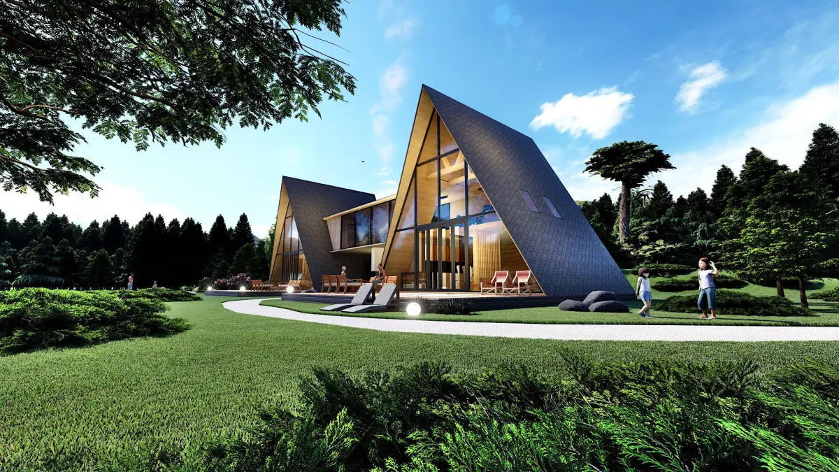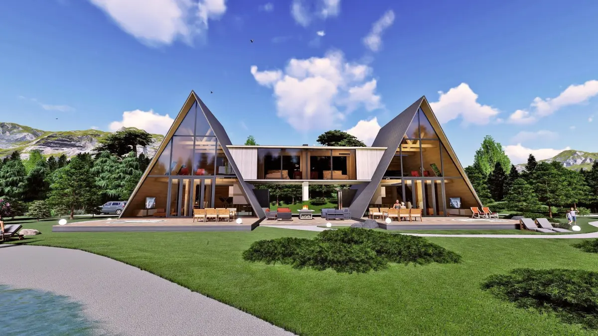 modern,double A frame house , glamping,glamorous camping, vacation house, tiny house,hut,unit by damijan koprivc. . Unit is suitable for camping sites , near sea or mountain areas.Great for vacation in nature camping resorts.It can be build by yourself.Its on 2 floors each a frame house conected with tunel*- space for bedroom with a view.under is lounge area with fire pit-grill, barbecue... Model is done with sketch up 2019 and rendered with lumion 10. All textures are in high resolution,have been checked and are included in scene.Textures are compressed in zip file.Model is easy to manipulate and ready to render with v-ray. 3DS Max and cinemy4dusers can import sketchup 2008 file format. Real world scale and exact proportions cm. Realistic and correctly scaled ! • Excellent polygon & texture efficiency Purchasing this model , you get files in different formats as :obj,skp,fbx or ask designer for different formats.BEST TO USE IT WITH SKETCHUP!