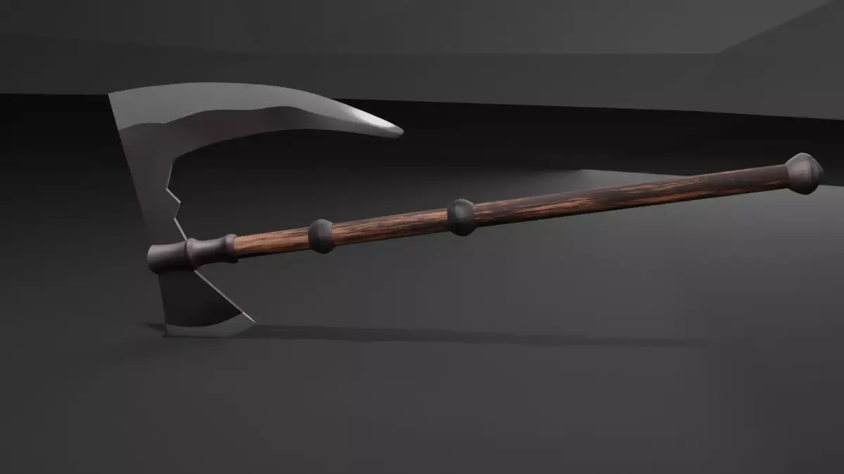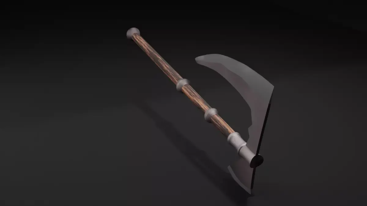 This is a stylized double-bladed fantasy axe featuring a curved steel blade design and a detailed wooden handle with metal reinforcements. The model is well-balanced between realism and stylization, making it suitable for games, cinematics, and real-time projects.