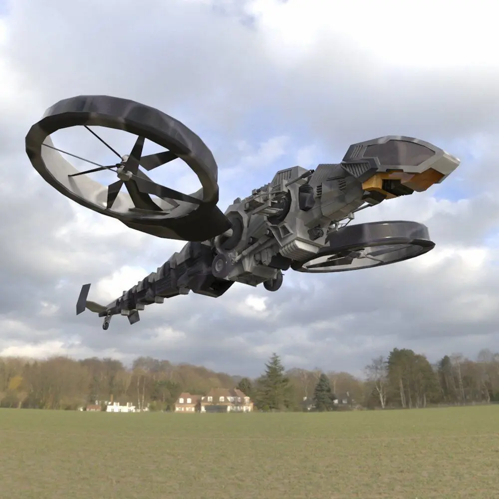 This is a double-bladed dragon-like attack vehicle.The cockpit can hold one pilot.Twin side-mounted guns can lay down suppressing fire or attack an enemy's position.The twin rotors can rotate to provide lift or thrust.