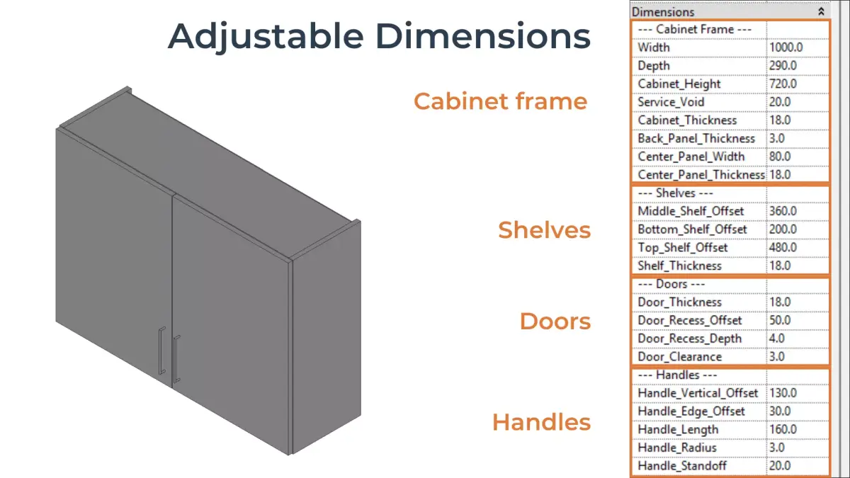 - Adjustable dimensions for cabinet frame, center panel, doors, shelves, and handles