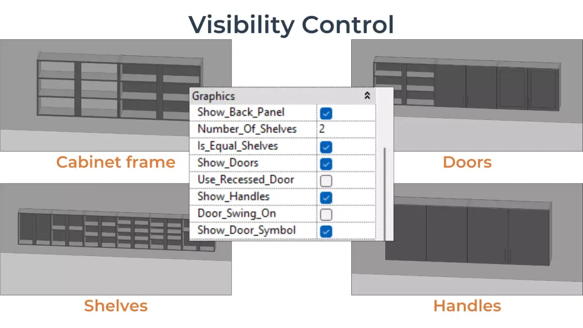 - Visibility controls for back panel, shelf, doors, and handles
