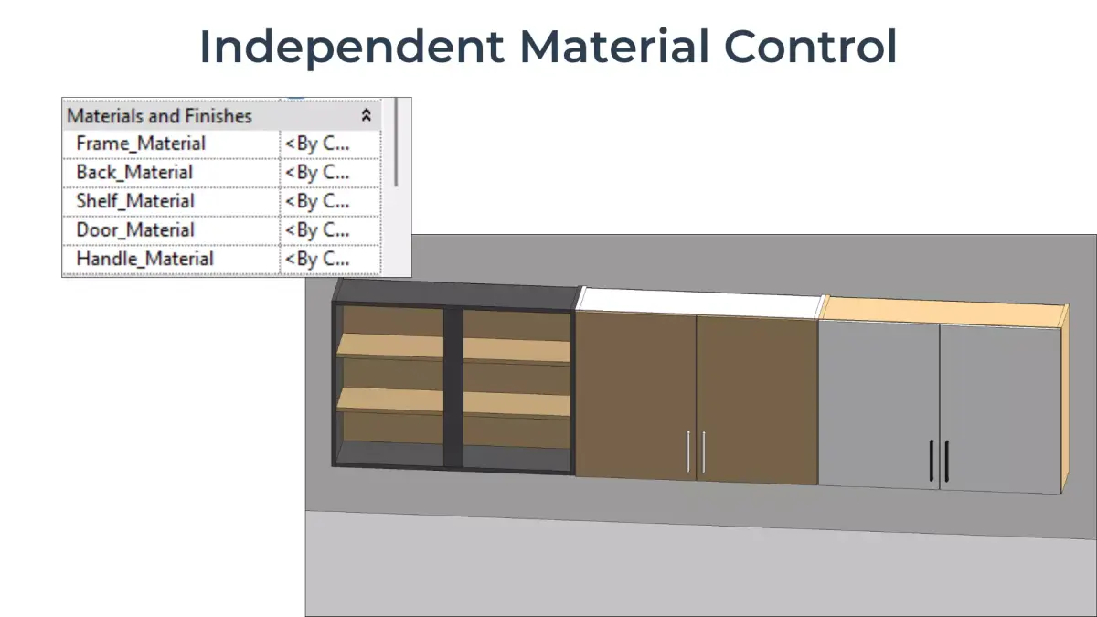 - Editable materials for cabinet frame, back panel, shelf, door fronts, and handles