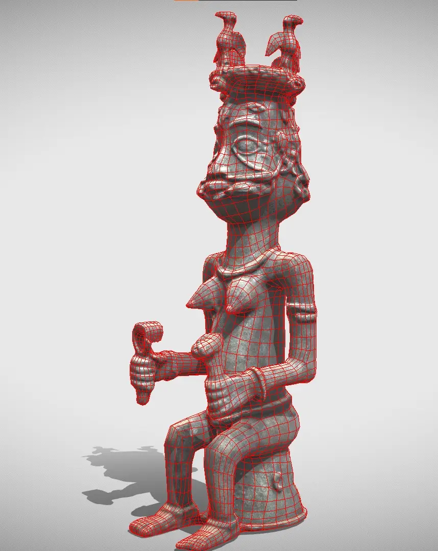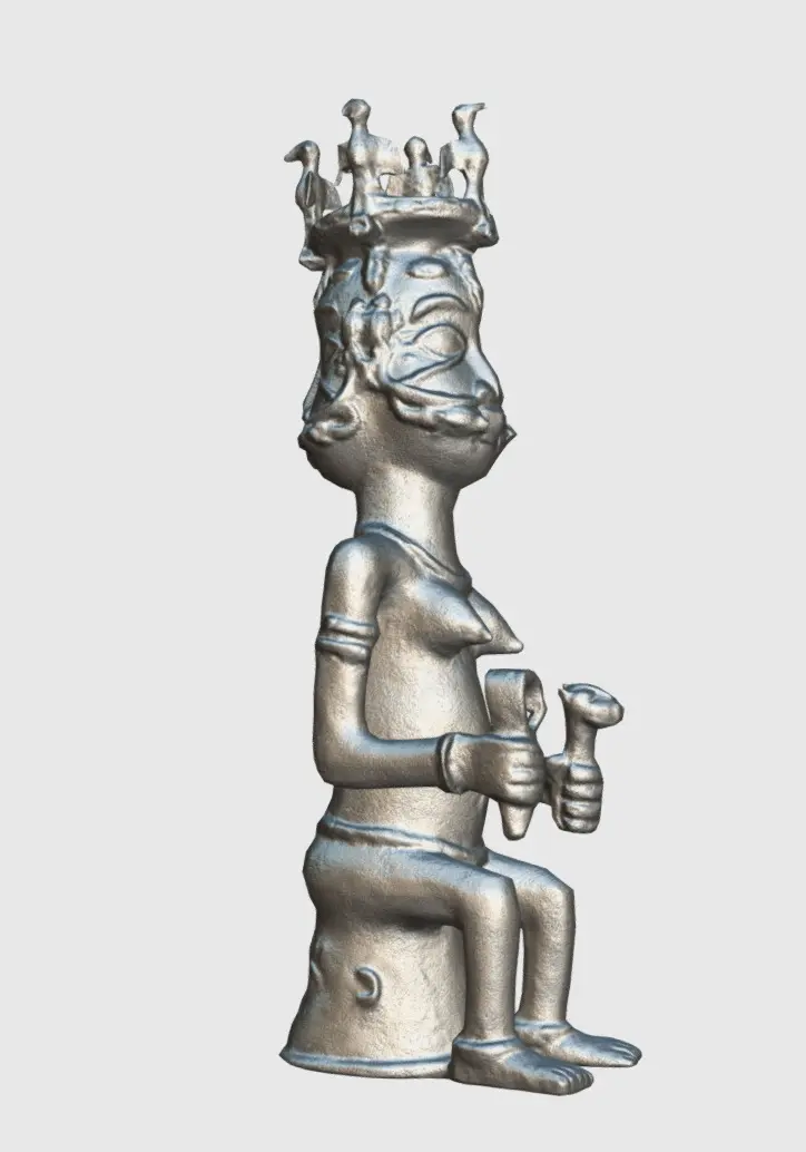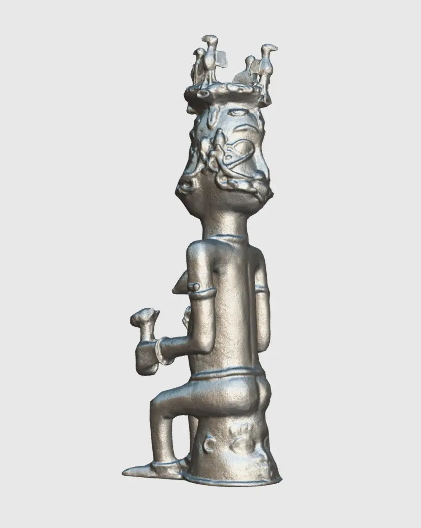 The top of the statue features an altar head with two faces, representing Osun, the deity of fertility, love, and water in the Yoruba and Edo traditions.The double faces might symbolize duality, balance, or the multifaceted nature of the deity.The main body of the figure is a feminine form with prominent breasts, emphasizing fertility and motherhood.The statue is holding objects in both hands. One of these objects has a face resembling a leopard, an animal symbolizing power, royalty, and cunning in Benin culture.