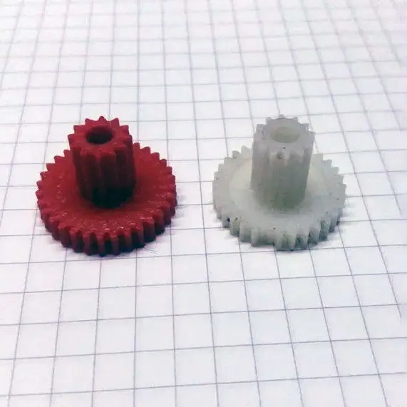 The double gear ( 12 - 32 teeth ) used in the climate control drive (mode actuator) for Hyundai Tucson and other compatible models, specifically identified by their corresponding part numbers 971542E200 and 971592E200. The gear has been tested to ensure compatibility with CoPET (PETG) filament printing.