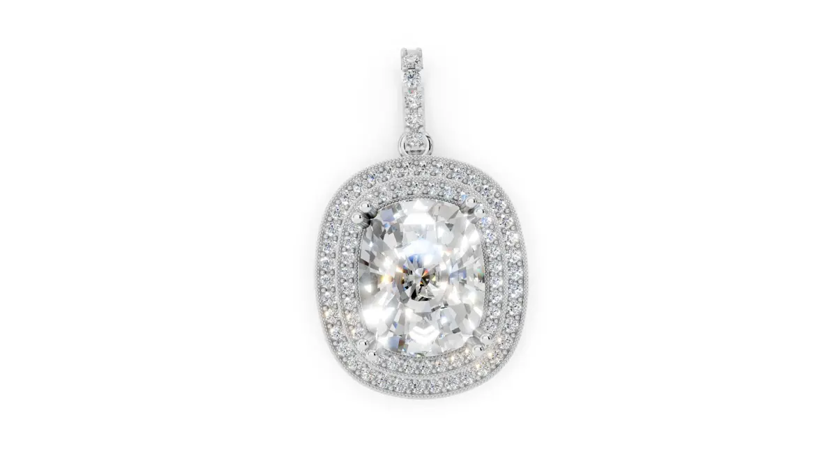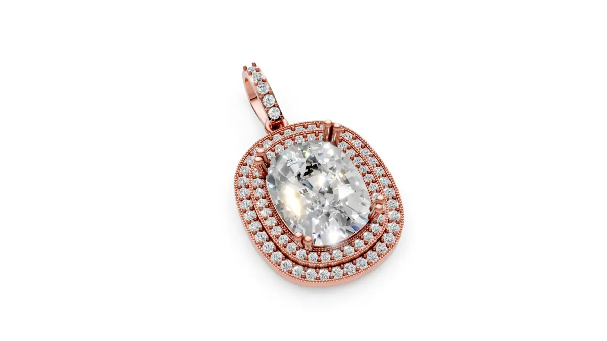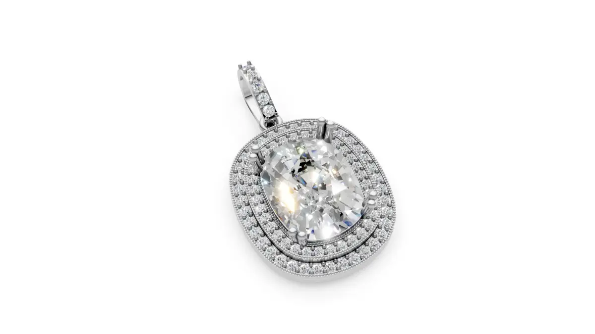 Bail height: 5.70 units (vertical measurement of the circular attachment loop)Bail width: 7.70 units (horizontal measurement across the bail opening)Gemstone Configuration: The design incorporates a total of 78 individual stones with a combined weight of 18.20 units (likely carats). The gemstone arrangement includes a primary cushion-cut center stone measuring 15.00 x 12.00 units, surrounded by various smaller round stones with dimensions ranging from 1.50 x 1.50 to 1.70 x 1.70 units, creating a graduated halo effect that enhances the central stone's prominence while providing additional brilliance and visual impact to the overall design.