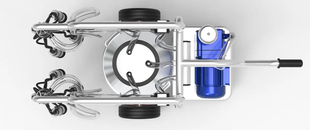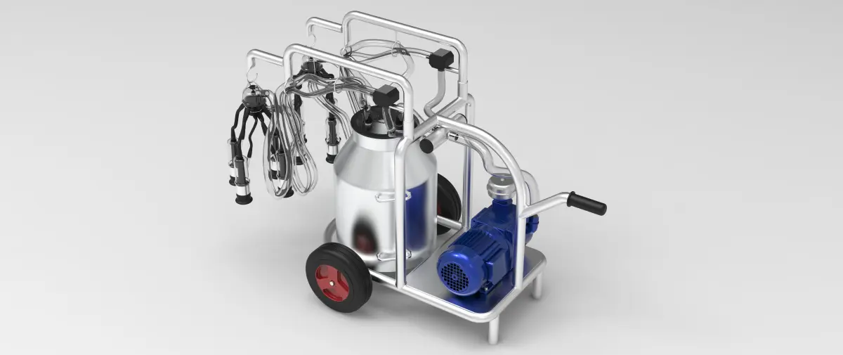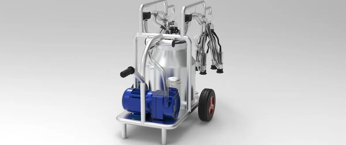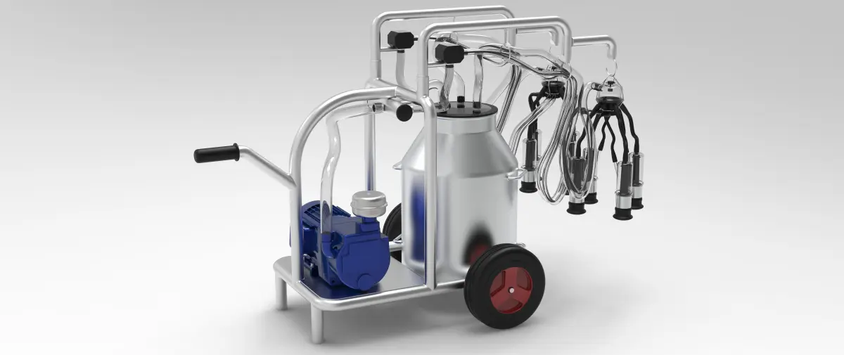 This machine is used for cow milking. Its portability provides convenience. It is mostly used in small farm businesses. Parts other than the skeleton are standard. Parts are readily available. It is suitable for production. (You should choose the pump according to the system you will use.)