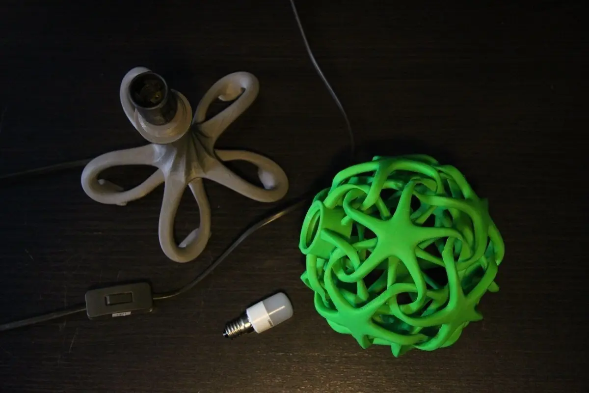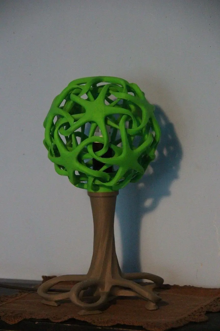 Double star lamp shade with lamp base. Lamp and base has screw threads which connect them. Lamp base has holes for wire and for sleeve (recommended 10x1m threaded sleeve) to mount bulb holder. Dimensions (mounted) 17,5 x 17,8 x 31,8 cm.Timelapse movie: https://www.youtube.com/watch?v=0H3_Ng72eWQ