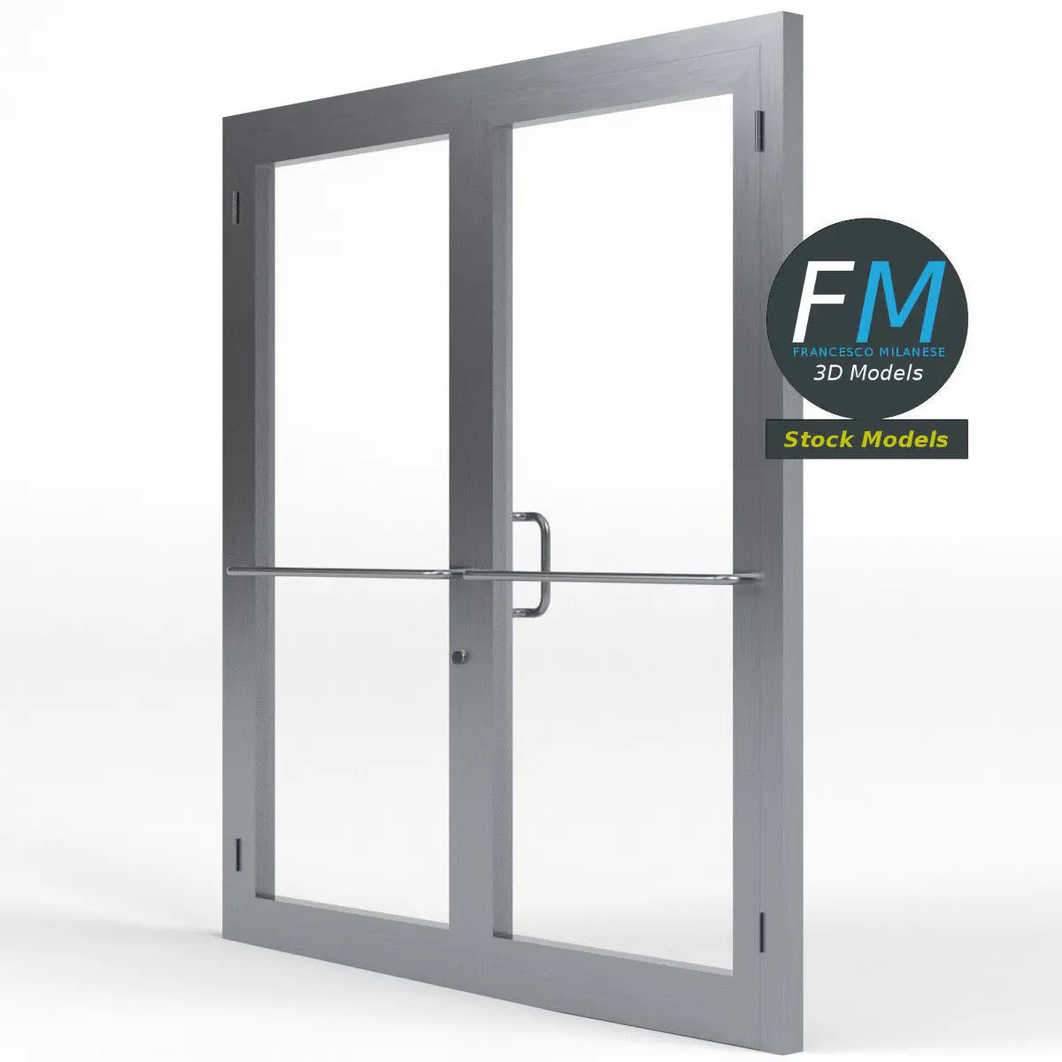 Double storefront glass door 3D Model. 5 individual objects (frame, right door, right glass, left door, left glass), sharing 2 non overlapping UV Layout maps, Materials (glass, frame) and PBR Textures sets. Production-ready 3D Model, with PBR materials, textures, non overlapping UV Layout map provided in the package.Quads only geometries (no tris/ngons).Easily customizable: UV unwrapped geometries; UV Layout maps provided in the package as png with alpha images.Each Object, Material or Texture provided in the package has a unique, meaningful name.Made in Blender 3.6.1 LTS with Cycles Principled BSDF PBR shader with textures included (Eevee compatible), then exported to OBJ and FBX; materials and textures made in Substance Painter (Adobe 3D Painter), exported for PBR, Cycles, V-Ray, Unity, Unreal.PROMO IMAGES: the first image has been rendered in Cycles for Blender; in particular, you can find 11+ promo images in this description: