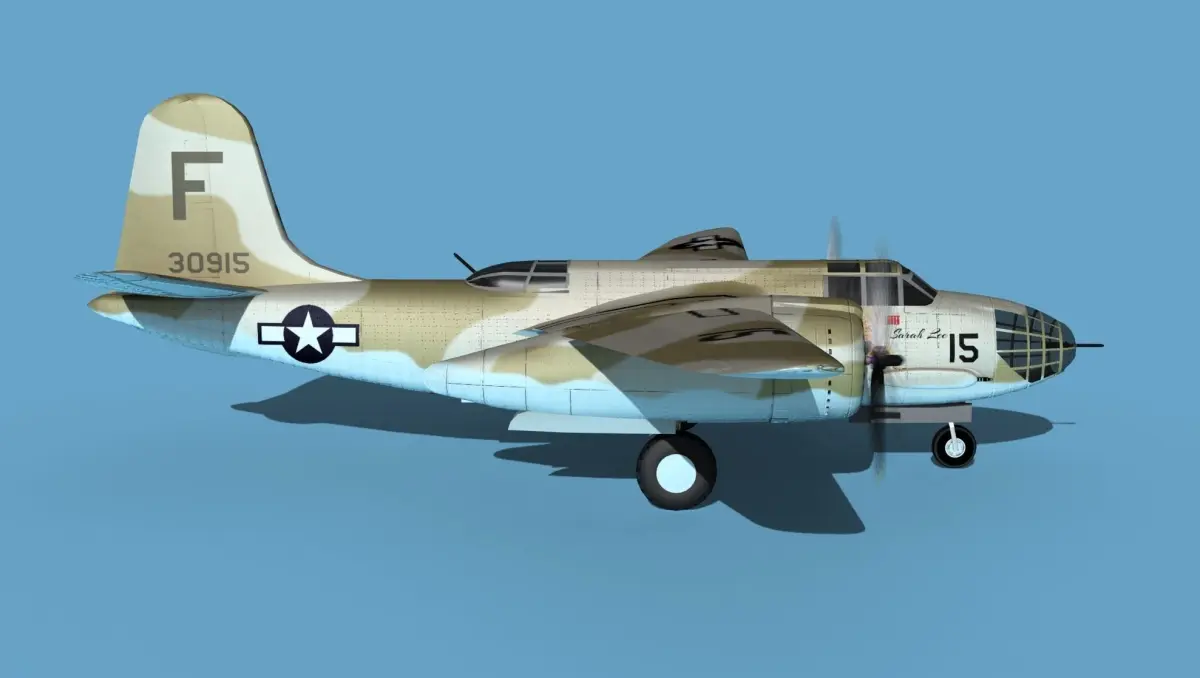 The Douglas A-20A was built beginning before the US entered WWII. It was built as a low level twin engine attack bomber for the USAAF. It served in every theater of operation in WWII and as the Douglas DB-7 Boston for units sold to many allied nations. It was produced in large numbers for many air forces and saw considerable combat all over the world. It carried bombs in a fuselage internal bombay and on pylons under the wings, as well as heavy machine guns mounted variously in the nose, on the sides of the fuselage and in the radio navigators compartment or in a turret mounted aft.