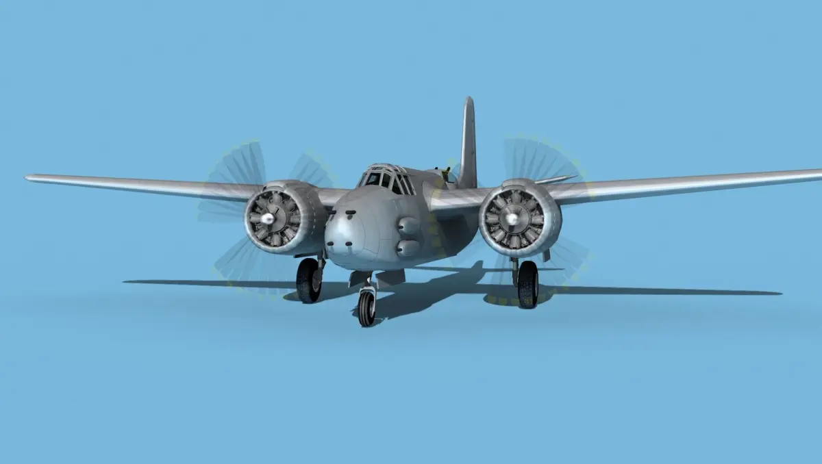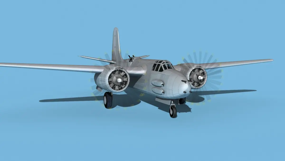 The Douglas A-20G was a further development of the Douglas A-20 series bomber. It was built in the later war around 1943 and 44. It was developed and improved as a low level twin engine attack bomber. It served in every theater of operation in WWII and in many countries air forces and as the Douglas DB-7 Mk III Boston for units sold to allied nations. It was produced in large numbers for many air forces and saw considerable combat all over the world. It carried bombs in a Bombay and on pylons under the wings, as well as heavy machine guns mounted variously in the nose, on the sides of the fuselage and in the radio navigators compartment or in a turret mounted aft.