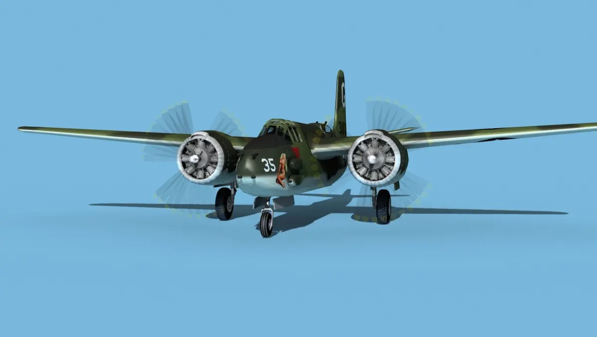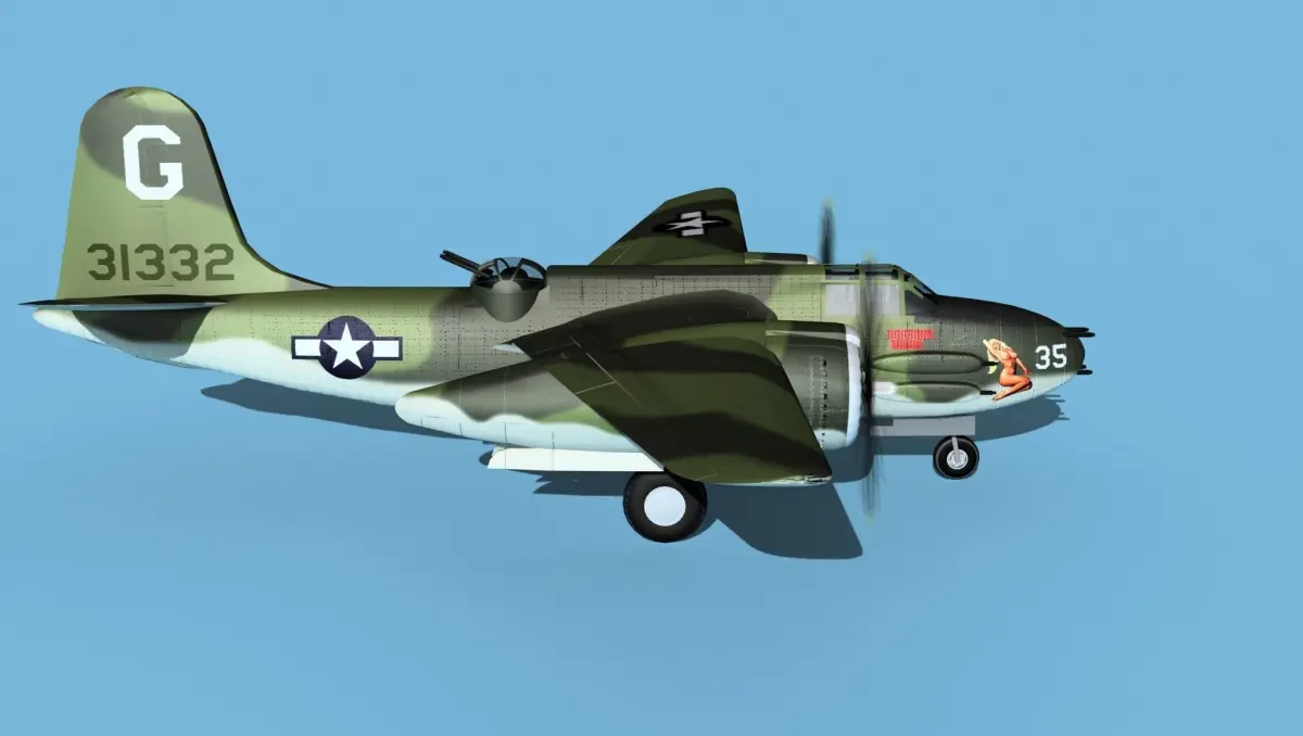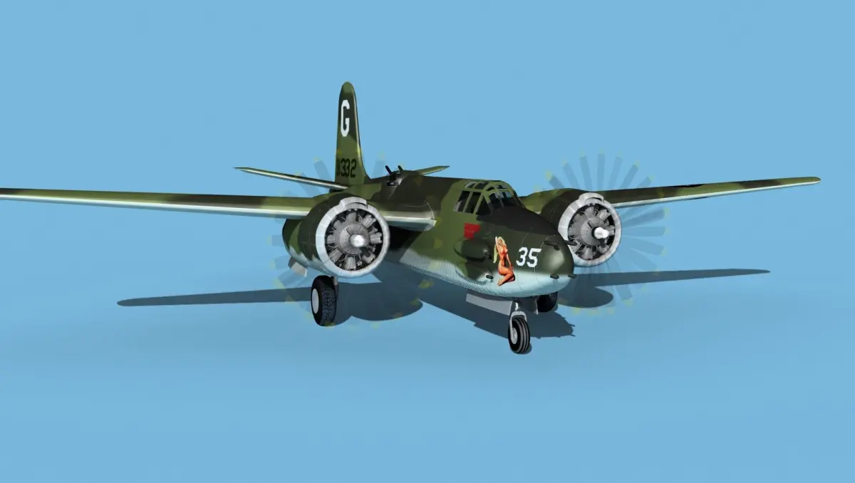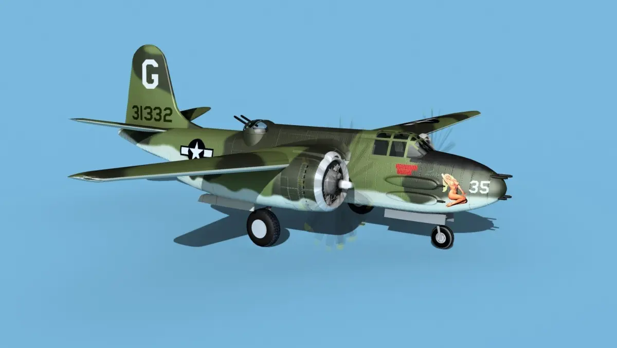 The Douglas A-20G was a further development of the Douglas A-20 series bomber. It was built in the later war around 1943 and 44. It was developed and improved as a low level twin engine attack bomber. It served in every theater of operation in WWII and in many countries air forces and as the Douglas DB-7 Mk III Boston for units sold to allied nations. It was produced in large numbers for many air forces and saw considerable combat all over the world. It carried bombs in a Bombay and on pylons under the wings, as well as heavy machine guns mounted variously in the nose, on the sides of the fuselage and in the radio navigators compartment or in a turret mounted aft.