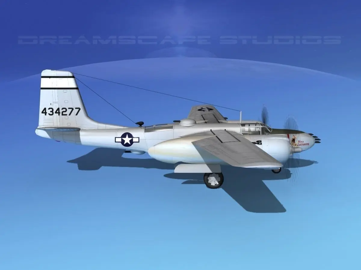 The Douglas A-26B, A-26C, B-26B, B-26C, and A-26K built by Dreamscape Studios are our latest high value models. These models are built near to scale (within a couple of percent in overall dimensions), fully painted and textured with realistic maps, and includes a great deal of detail. The model includes geometrically detailed radial engines (although the A and B-26 had twin row radials we only used a single row radial to keep poly count at a more reasonable level. Much of the cockpit, rear gunners position and in the C models the forward position have some detail and major components are modeled. The cockpit detail include seat, controls and instrumentation, rudder pedals and step down passage for the C models. These models also have animated propellers, animateable ailerons, elevators, flaps, inboard flaps, rudder, cowling flaps, landing gear retraction and landing gear doors.
