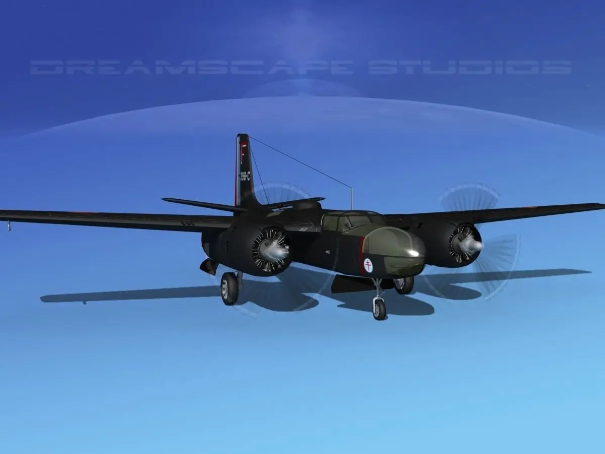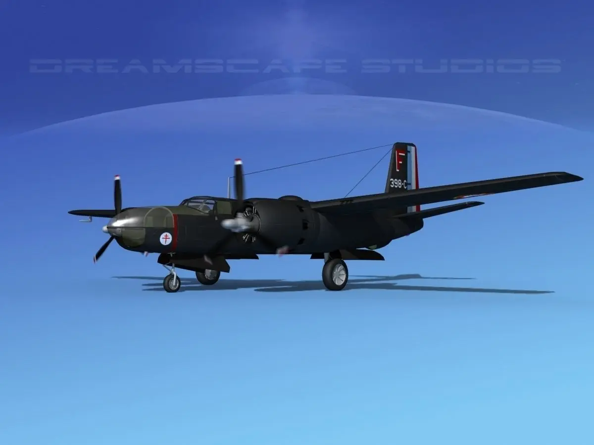 The Douglas A-26B, A-26C, B-26B, B-26C, and A-26K built by Dreamscape Studios are our latest high value models. These models are built near to scale (within a couple of percent in overall dimensions), fully painted and textured with realistic maps, and includes a great deal of detail. The model includes geometrically detailed radial engines (although the A and B-26 had twin row radials we only used a single row radial to keep poly count at a more reasonable level. Much of the cockpit, rear gunners position and in the C models the forward position have some detail and major components are modeled. The cockpit detail include seat, controls and instrumentation, rudder pedals and step down passage for the C models. These models also have animated propellers, animateable ailerons, elevators, flaps, inboard flaps, rudder, cowling flaps, landing gear retraction and landing gear doors.