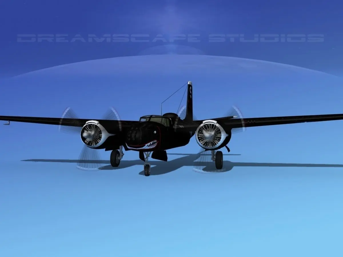 The Douglas A-26B, A-26C, B-26B, B-26C, and A-26K built by Dreamscape Studios are our latest high value models. These models are built near to scale (within a couple of percent in overall dimensions), fully painted and textured with realistic maps, and includes a great deal of detail. The model includes geometrically detailed radial engines (although the A and B-26 had twin row radials we only used a single row radial to keep poly count at a more reasonable level. Much of the cockpit, rear gunners position and in the C models the forward position have some detail and major components are modeled. The cockpit detail include seat, controls and instrumentation, rudder pedals and step down passage for the C models. These models also have animated propellers, animateable ailerons, elevators, flaps, inboard flaps, rudder, cowling flaps, landing gear retraction and landing gear doors.