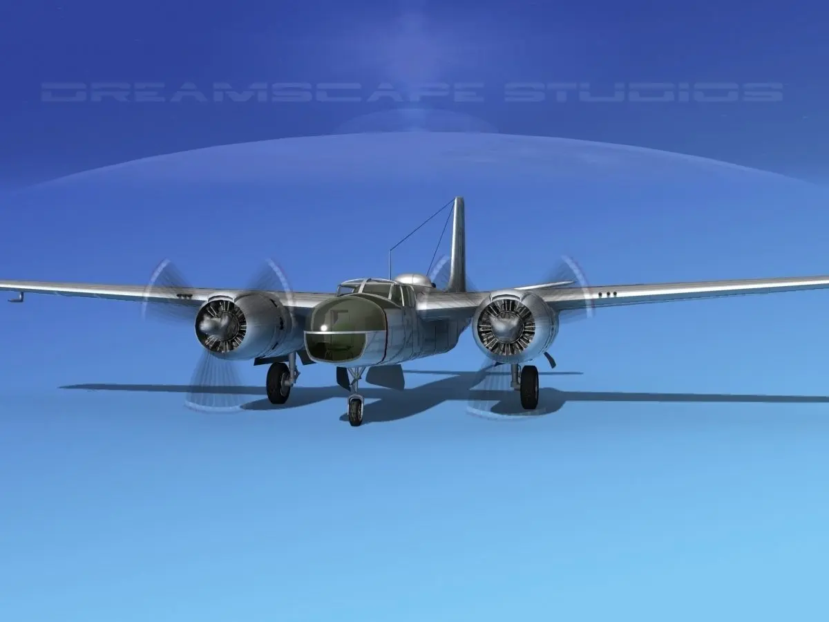 The Douglas A-26B, A-26C, B-26B, B-26C, and A-26K built by Dreamscape Studios are our latest high value models. These models are built near to scale (within a couple of percent in overall dimensions), fully painted and textured with realistic maps, and includes a great deal of detail. The model includes geometrically detailed radial engines (although the A and B-26 had twin row radials we only used a single row radial to keep poly count at a more reasonable level. Much of the cockpit, rear gunners position and in the C models the forward position have some detail and major components are modeled. The cockpit detail include seat, controls and instrumentation, rudder pedals and step down passage for the C models. These models also have animated propellers, animateable ailerons, elevators, flaps, inboard flaps, rudder, cowling flaps, landing gear retraction and landing gear doors.