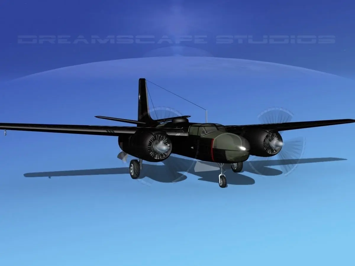 The Douglas A-26B, A-26C, B-26B, B-26C, and A-26K built by Dreamscape Studios are our latest high value models. These models are built near to scale (within a couple of percent in overall dimensions), fully painted and textured with realistic maps, and includes a great deal of detail. The model includes geometrically detailed radial engines (although the A and B-26 had twin row radials we only used a single row radial to keep poly count at a more reasonable level. Much of the cockpit, rear gunners position and in the C models the forward position have some detail and major components are modeled. The cockpit detail include seat, controls and instrumentation, rudder pedals and step down passage for the C models. These models also have animated propellers, animateable ailerons, elevators, flaps, inboard flaps, rudder, cowling flaps, landing gear retraction and landing gear doors.