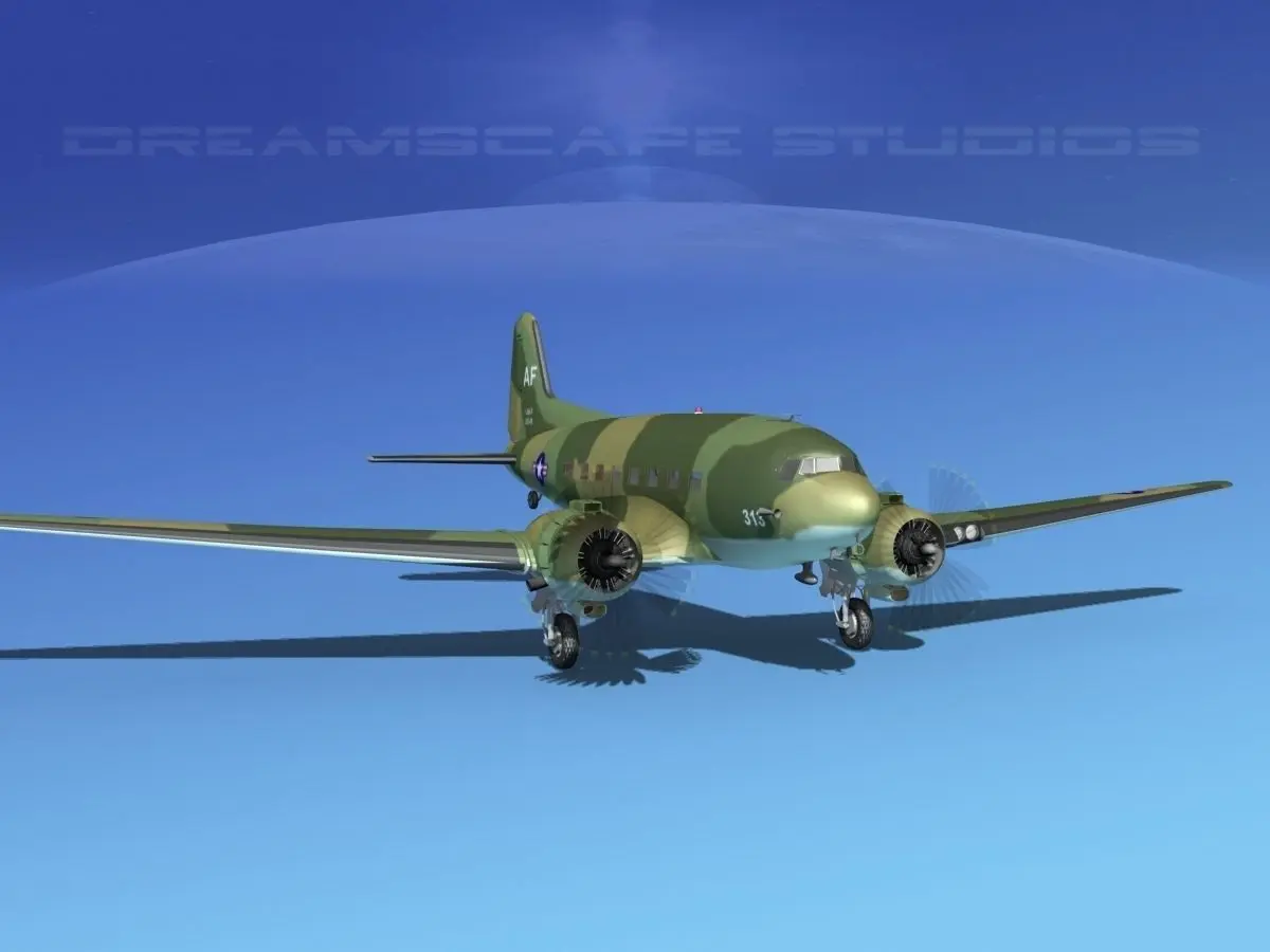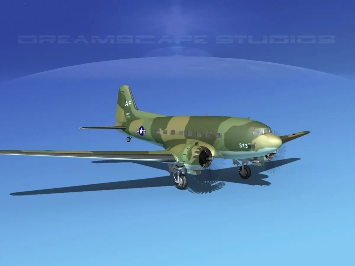 The Douglas C-47 Skytrain was also known as the Goonybird, Skytrooper and Dakota. It was developed from the Civilian Douglas DC-3. It was used extensively by the Allies during World War II to ferry cargo and personnel all over the world, to carry paratroopers, tow gliders, and for logistical and utility uses. The aircraft could carry up to 28 troops plus a pilot, co-pilot, navigator and radio operator. A cargo master was also employed in many operations. They were powered by Pratt and Whitney R1830-901C Twin Wasp 14 cylinder radial engines driving 3 bladed variable pitch propellers. The landing gear were retractable and in could operate from rough fields. They were used by every allied service during World War II. They continue to serve in many military and civilian operations around the world to this day. Recently a turboprop conversion has been accomplished to add even more lifespan to these enduring aircraft.