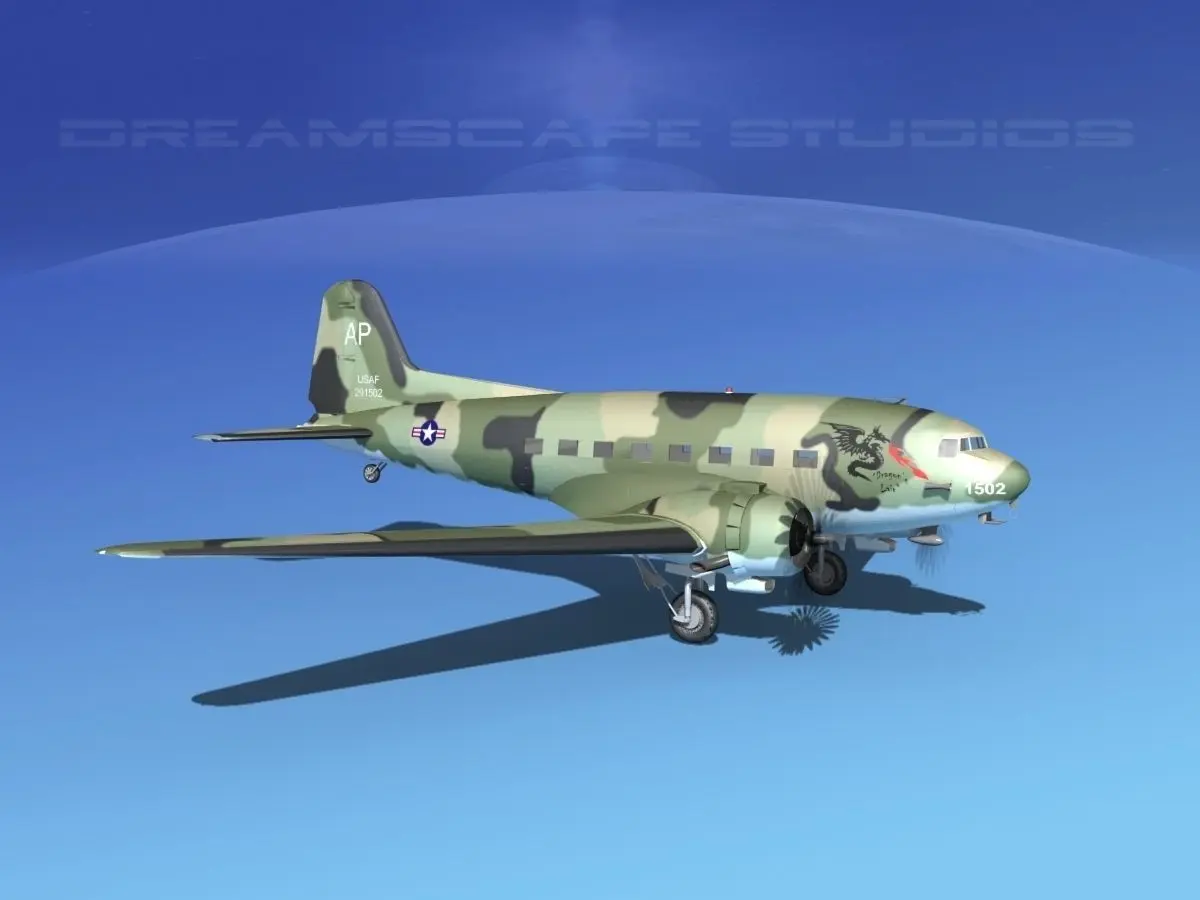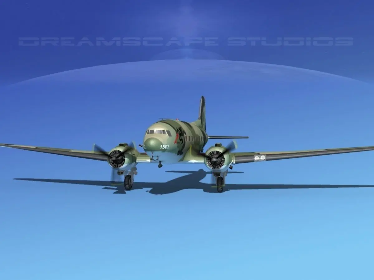The Douglas C-47 Skytrain was also known as the Goonybird, Skytrooper and Dakota. It was developed from the Civilian Douglas DC-3. It was used extensively by the Allies during World War II to ferry cargo and personnel all over the world, to carry paratroopers, tow gliders, and for logistical and utility uses. The aircraft could carry up to 28 troops plus a pilot, co-pilot, navigator and radio operator. A cargo master was also employed in many operations. They were powered by Pratt and Whitney R1830-901C Twin Wasp 14 cylinder radial engines driving 3 bladed variable pitch propellers. The landing gear were retractable and in could operate from rough fields. They were used by every allied service during World War II. They continue to serve in many military and civilian operations around the world to this day. Recently a turboprop conversion has been accomplished to add even more lifespan to these enduring aircraft.