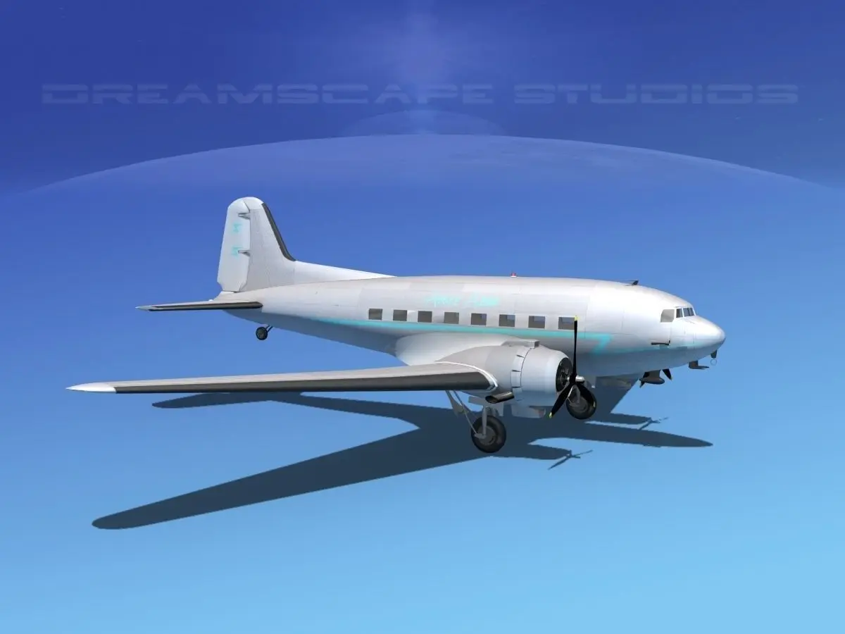 Dreamscape DC-3 was built near to scale and in good detail. It has a great deal of engine detail. The propellers, landing gear elevators, ailerons, rudder and flaps are animateable. It is fully textured and comes in 12 different formats and in many different airliners liveries.
