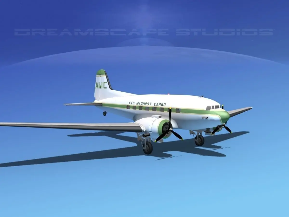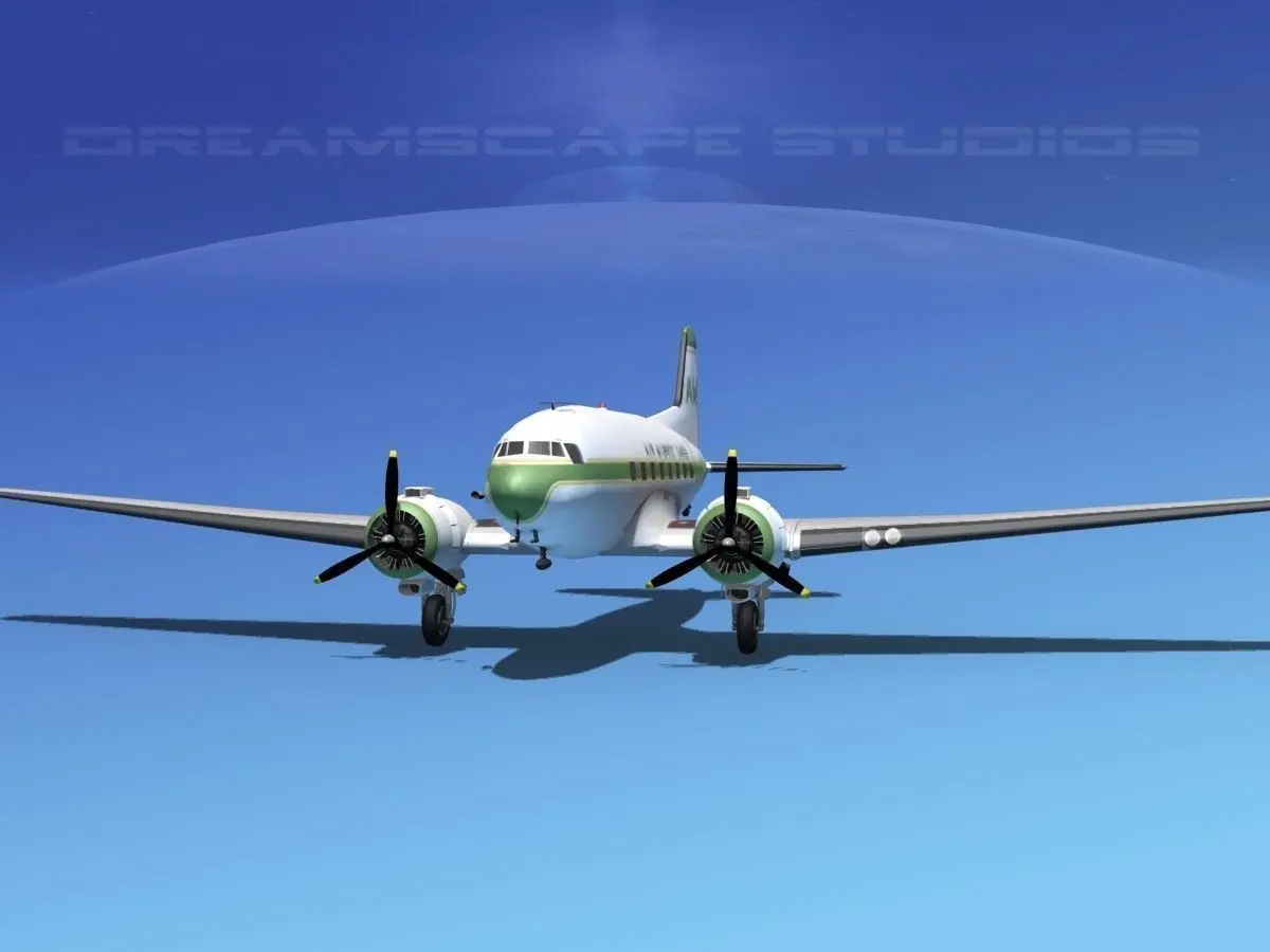 Dreamscape DC-3 was built near to scale and in good detail. It has a great deal of engine detail. The propellers, landing gear elevators, ailerons, rudder and flaps are animateable. It is fully textured and comes in 12 different formats and in many different airliners liveries.