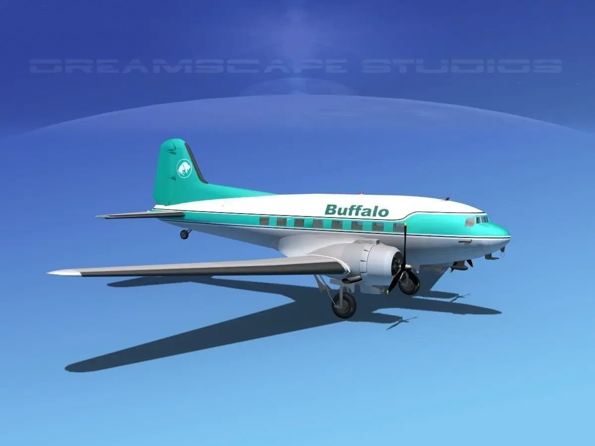 Dreamscape DC-3 was built near to scale within few inches of actual general dimensions and in good detail. It has a great deal of engine detail. The propellers, landing gear elevators, ailerons, rudder and flaps are animateable. It is fully textured and comes in 12 different formats and in many different airliners liveries.