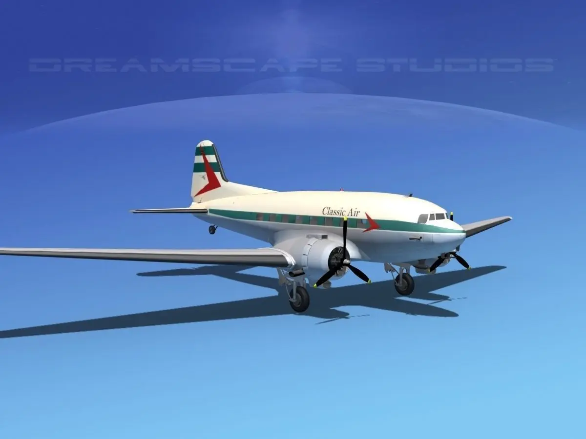Dreamscape DC-3 was built near to scale within few inches of actual general dimensions and in good detail. It has a great deal of engine detail. The propellers, landing gear elevators, ailerons, rudder and flaps are animateable. It is fully textured and comes in 12 different formats and in many different airliners liveries.