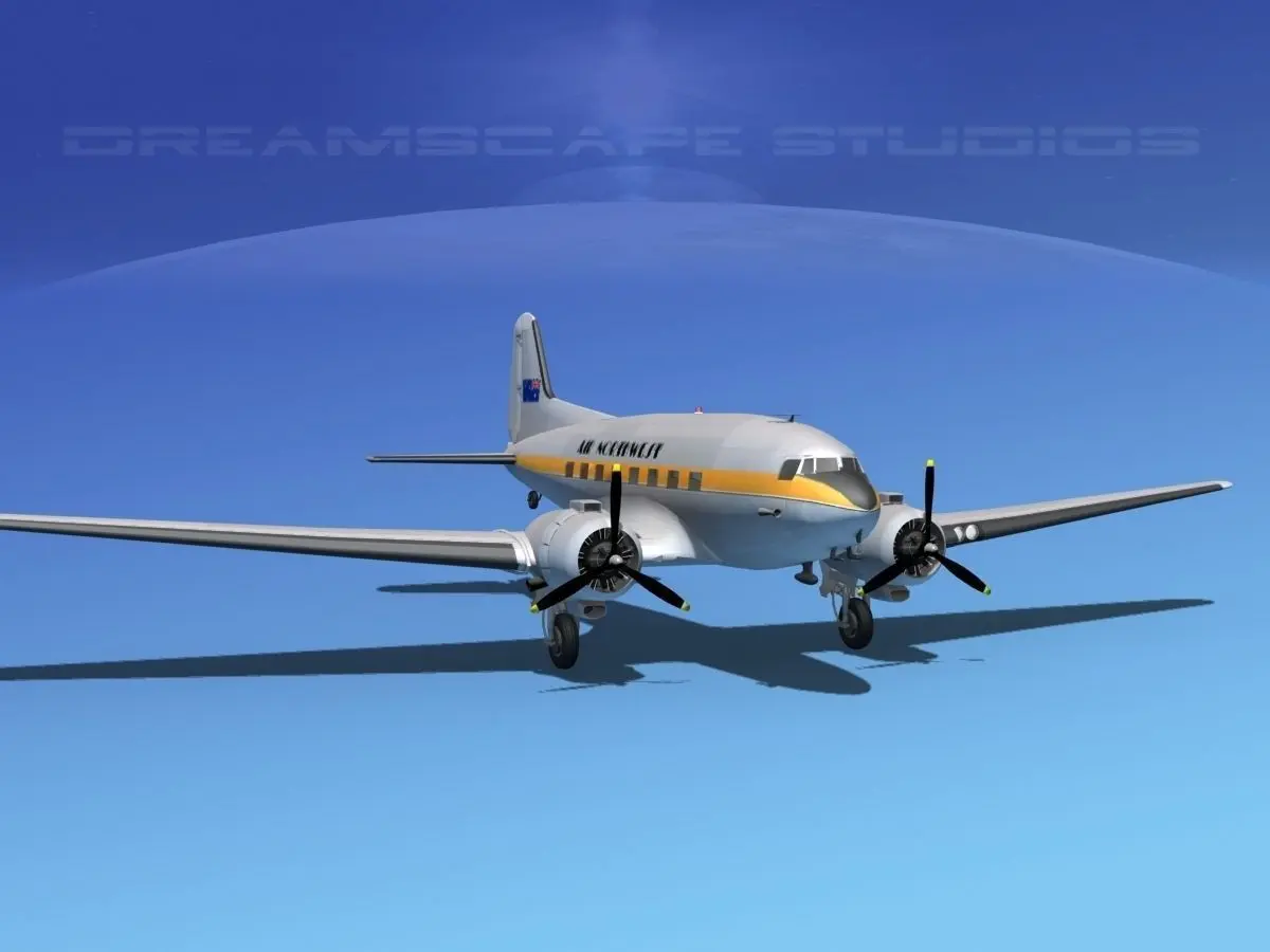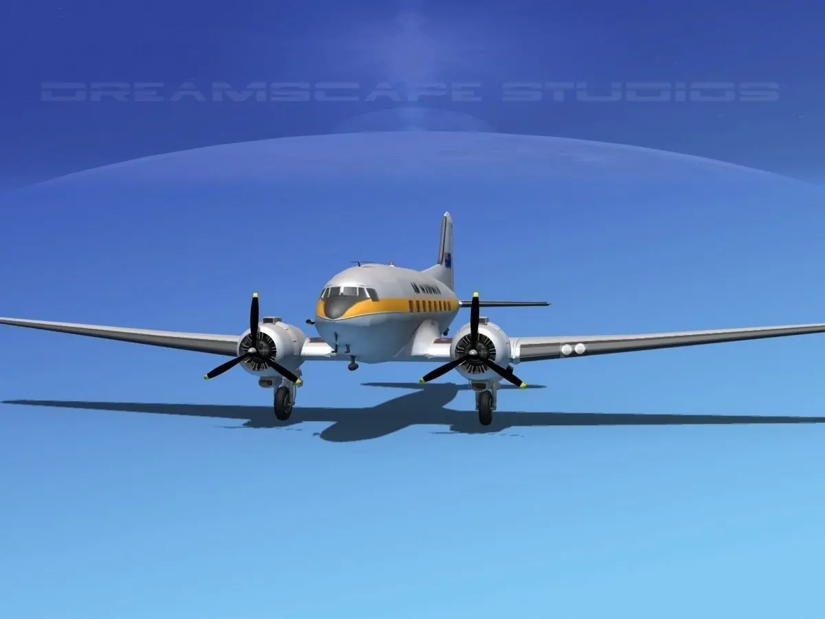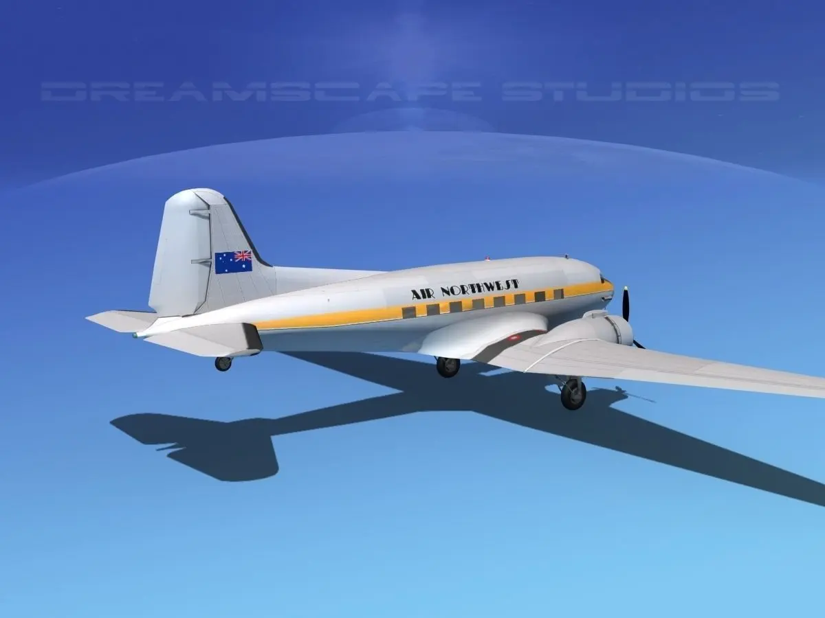 Dreamscape DC-3 was built near to scale and in good detail. It has a great deal of engine detail. The propellers, landing gear elevators, ailerons, rudder and flaps are animateable. It is fully textured and comes in 12 different formats and in many different airliners liveries.