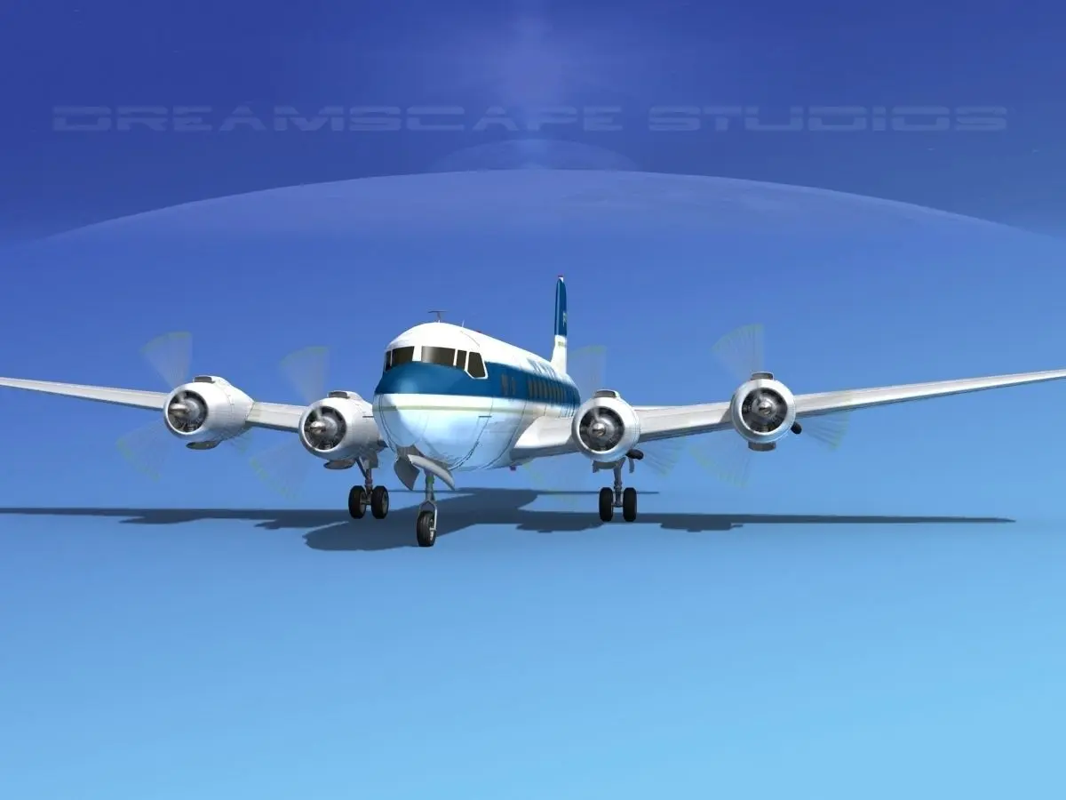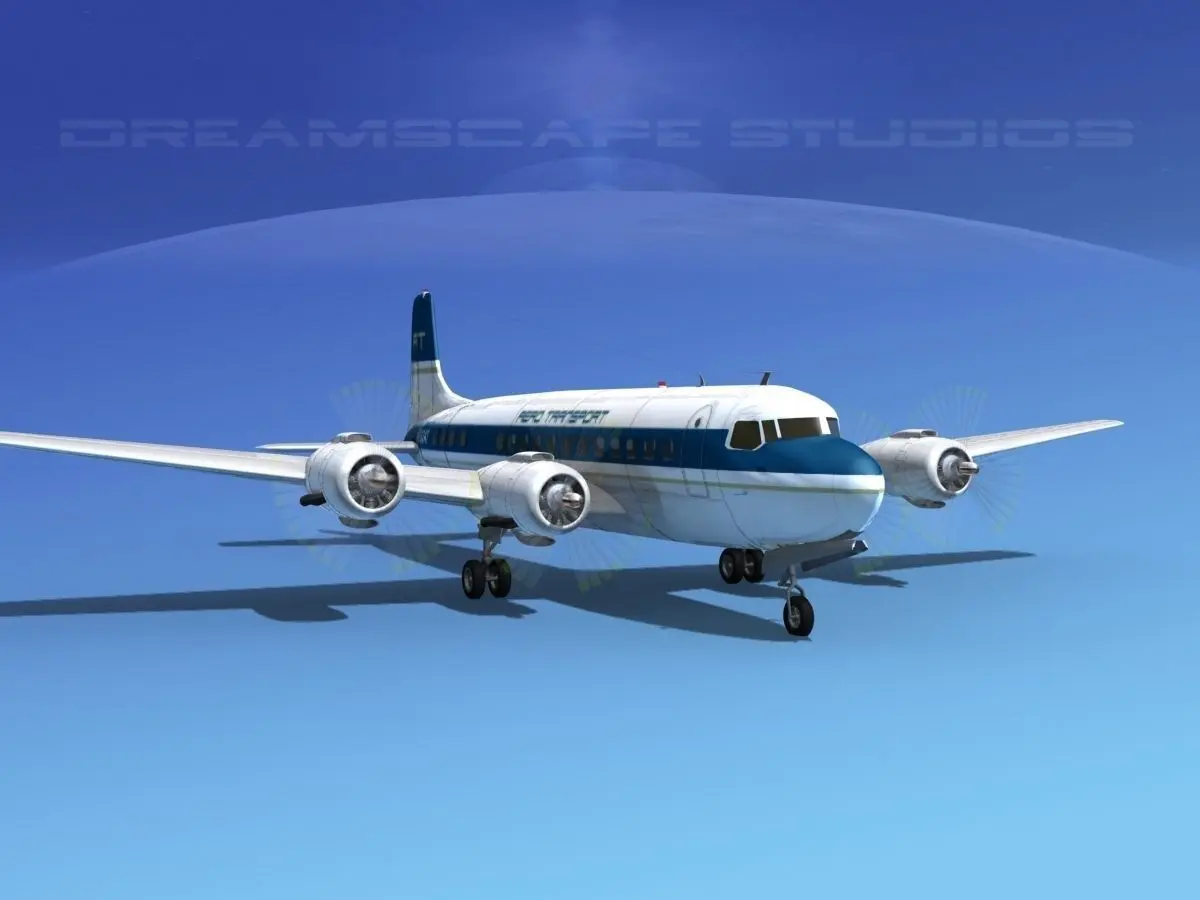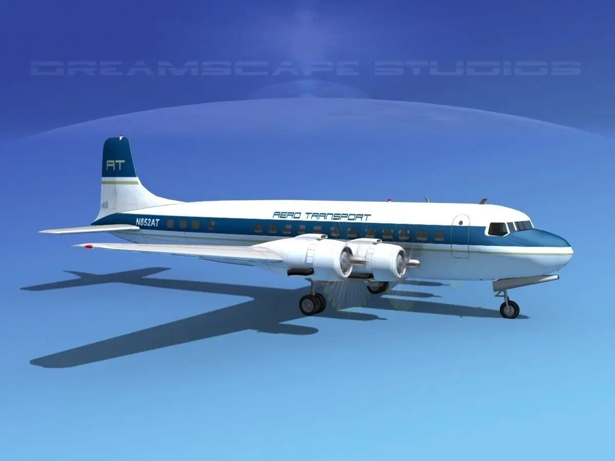 This high quality detailed polygonal model is built nearly scale for an accurate representation of the original object. All textures and materials are included and UVW mapped in most formats. It includes animateable landing gear, landing gear doors, ailerons, elevators, rudder and flaps. Propellers are animated. It comes in multiple formats and airline liveries.The Douglas DC-6 is a piston-powered airliner and transport aircraft built by the Douglas Aircraft Company from 1946 to 1958. Originally intended as a military transport near the end of World War II, it was reworked after the war in the long-range commercial transport market. More than 700 were built and many still fly today in cargo, military and wildfire control roles.The DC-6 was known as the C-118 Liftmaster in United States Air Force service and as the R6D in United States Navy service prior to 1962, after which all U.S. Navy variants were also designated as the C-118.