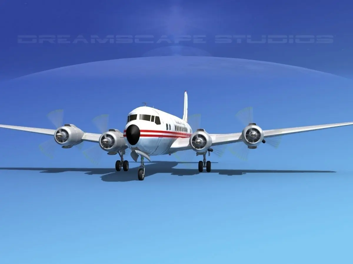 This high quality detailed polygonal model is built nearly scale for an accurate representation of the original object. All textures and materials are included and UVW mapped in most formats. It includes animateable landing gear, landing gear doors, ailerons, elevators, rudder and flaps. Propellers are animated. It comes in multiple formats and airline liveries.The Douglas DC-6 is a piston-powered airliner and transport aircraft built by the Douglas Aircraft Company from 1946 to 1958. Originally intended as a military transport near the end of World War II, it was reworked after the war in the long-range commercial transport market. More than 700 were built and many still fly today in cargo, military and wildfire control roles.The DC-6 was known as the C-118 Liftmaster in United States Air Force service and as the R6D in United States Navy service prior to 1962, after which all U.S. Navy variants were also designated as the C-118.