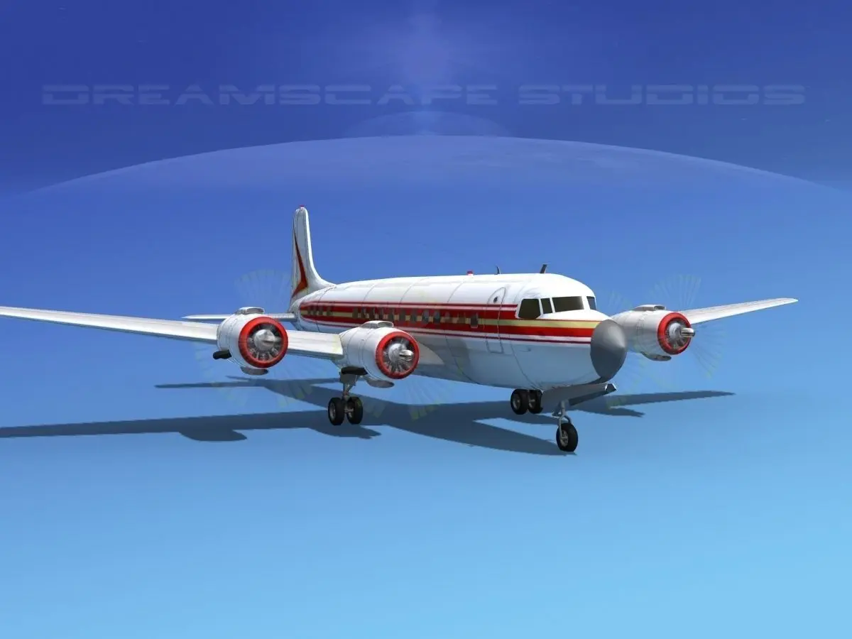 This high quality detailed polygonal model is built nearly scale for an accurate representation of the original object. All textures and materials are included and UVW mapped in most formats. It includes animateable landing gear, landing gear doors, ailerons, elevators, rudder and flaps. Propellers are animated. It comes in multiple formats and airline liveries.The Douglas DC-6 is a piston-powered airliner and transport aircraft built by the Douglas Aircraft Company from 1946 to 1958. Originally intended as a military transport near the end of World War II, it was reworked after the war in the long-range commercial transport market. More than 700 were built and many still fly today in cargo, military and wildfire control roles.The DC-6 was known as the C-118 Liftmaster in United States Air Force service and as the R6D in United States Navy service prior to 1962, after which all U.S. Navy variants were also designated as the C-118.