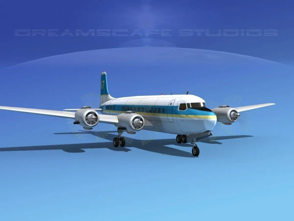 This high quality detailed polygonal model is built nearly scale for an accurate representation of the original object. All textures and materials are included and UVW mapped in most formats. It includes animateable landing gear, landing gear doors, ailerons, elevators, rudder and flaps. Propellers are animated. It comes in multiple formats and airline liveries.The Douglas DC-6 is a piston-powered airliner and transport aircraft built by the Douglas Aircraft Company from 1946 to 1958. Originally intended as a military transport near the end of World War II, it was reworked after the war in the long-range commercial transport market. More than 700 were built and many still fly today in cargo, military and wildfire control roles.The DC-6 was known as the C-118 Liftmaster in United States Air Force service and as the R6D in United States Navy service prior to 1962, after which all U.S. Navy variants were also designated as the C-118.