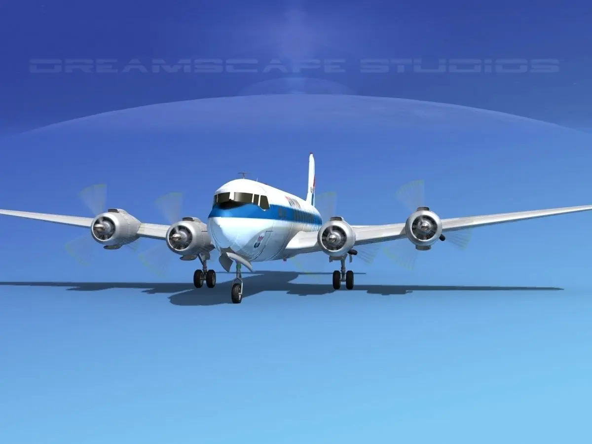 This high quality detailed polygonal model is built nearly scale for an accurate representation of the original object. All textures and materials are included and UVW mapped in most formats. It includes animateable landing gear, landing gear doors, ailerons, elevators, rudder and flaps. Propellers are animated. It comes in multiple formats and airline liveries.The Douglas DC-6 is a piston-powered airliner and transport aircraft built by the Douglas Aircraft Company from 1946 to 1958. Originally intended as a military transport near the end of World War II, it was reworked after the war in the long-range commercial transport market. More than 700 were built and many still fly today in cargo, military and wildfire control roles.The DC-6 was known as the C-118 Liftmaster in United States Air Force service and as the R6D in United States Navy service prior to 1962, after which all U.S. Navy variants were also designated as the C-118.