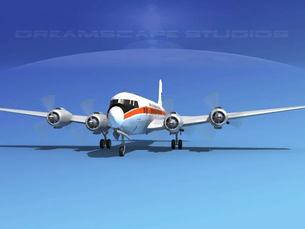 This high quality detailed polygonal model is built nearly scale for an accurate representation of the original object. All textures and materials are included and UVW mapped in most formats. It includes animateable landing gear, landing gear doors, ailerons, elevators, rudder and flaps. Propellers are animated. It comes in multiple formats and airline liveries.The Douglas DC-6 is a piston-powered airliner and transport aircraft built by the Douglas Aircraft Company from 1946 to 1958. Originally intended as a military transport near the end of World War II, it was reworked after the war in the long-range commercial transport market. More than 700 were built and many still fly today in cargo, military and wildfire control roles.The DC-6 was known as the C-118 Liftmaster in United States Air Force service and as the R6D in United States Navy service prior to 1962, after which all U.S. Navy variants were also designated as the C-118.