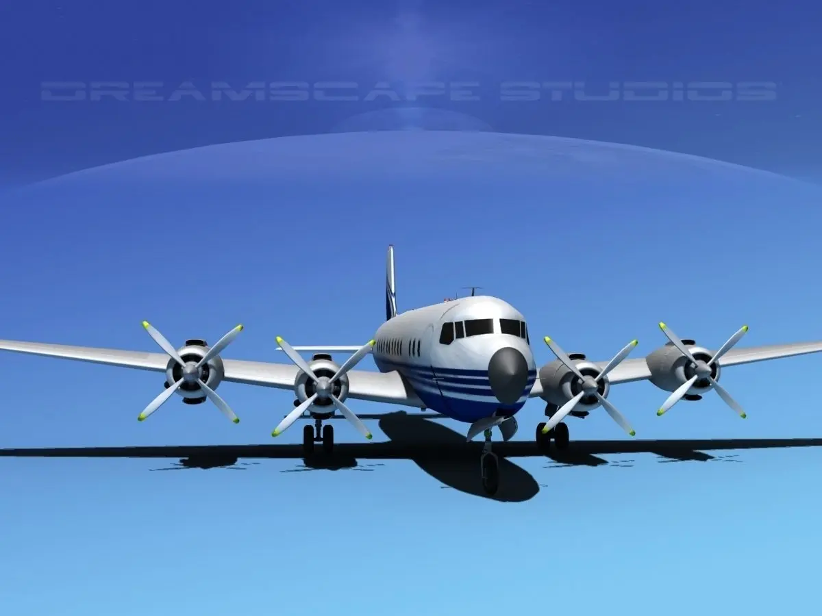 Douglas DC-7C was built near to scale by actual dimensions and in some good detail. Control surfaces are animateable including flaps, ailerons, elevators and rudder. Landing gear, landing gear doors and propellers are also animateable. A full double row radial engine is modeled in the cowlings and animateable cowling flaps are also modeled. In addition this model comes in a wide variety of formats.