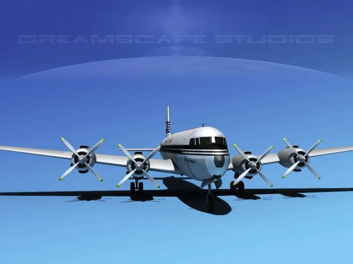 Douglas DC-7C was built near to scale by actual dimensions and in some good detail. Control surfaces are animateable including flaps, ailerons, elevators and rudder. Landing gear, landing gear doors and propellers are also animateable. A full double row radial engine is modeled in the cowlings and animateable cowling flaps are also modeled. In addition this model comes in a wide variety of formats.