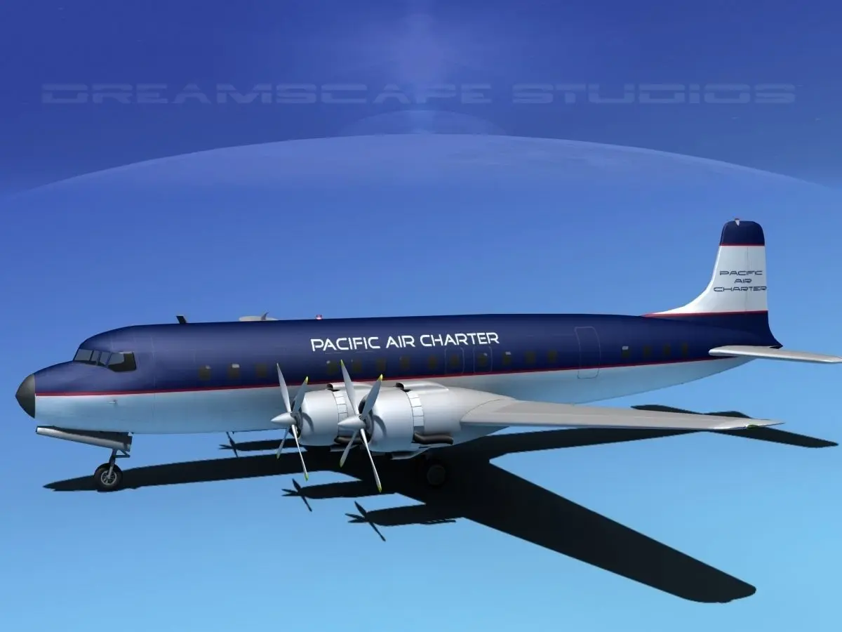 Douglas DC-7C was built near to scale by actual dimensions and in some good detail. Control surfaces are animateable including flaps, ailerons, elevators and rudder. Landing gear, landing gear doors and propellers are also animateable. A full double row radial engine is modeled in the cowlings and animateable cowling flaps are also modeled. In addition this model comes in a wide variety of formats.