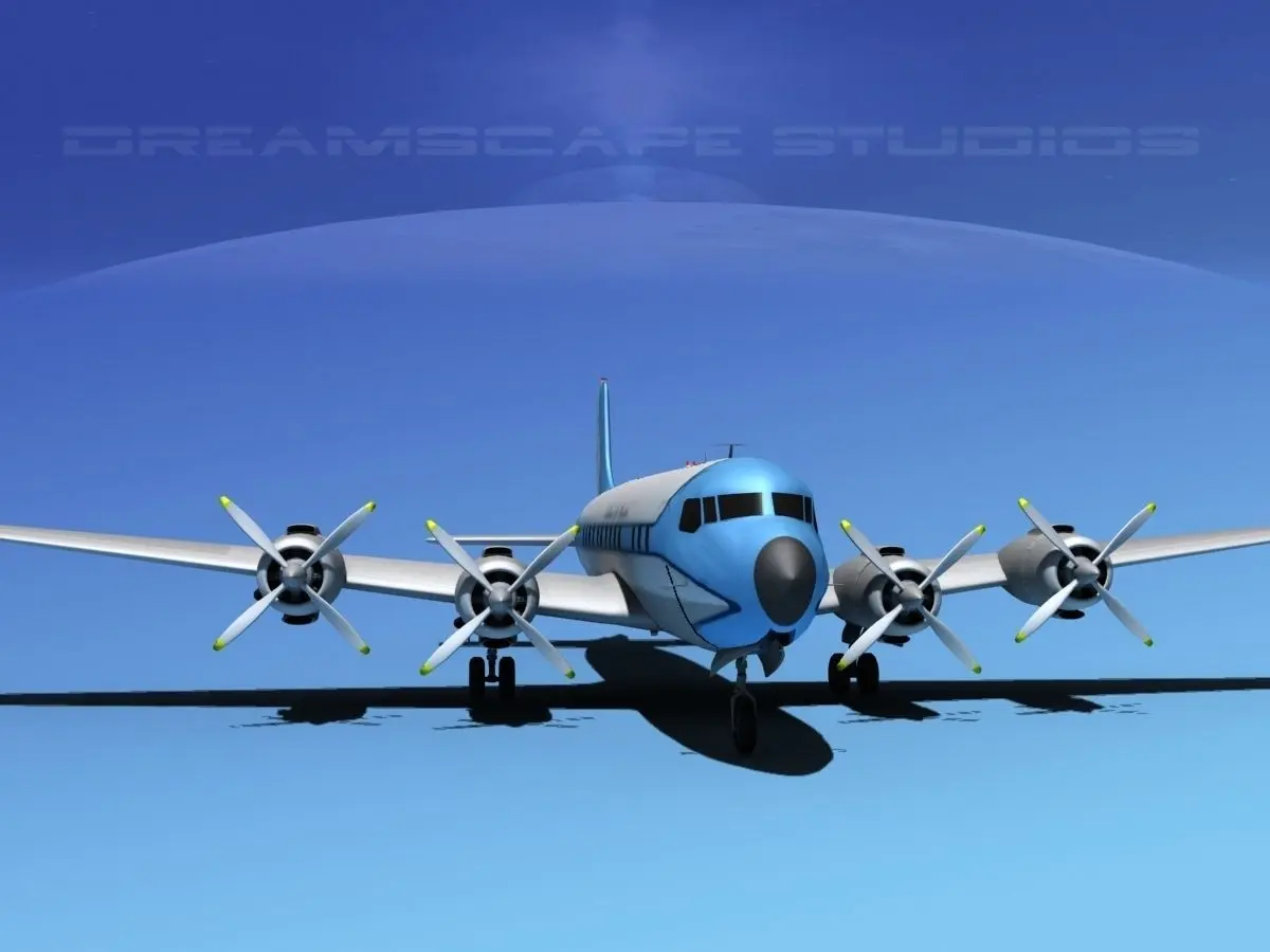 Douglas DC-7C was built near to scale by actual dimensions and in some good detail. Control surfaces are animateable including flaps, ailerons, elevators and rudder. Landing gear, landing gear doors and propellers are also animateable. A full double row radial engine is modeled in the cowlings and animateable cowling flaps are also modeled. In addition this model comes in a wide variety of formats.