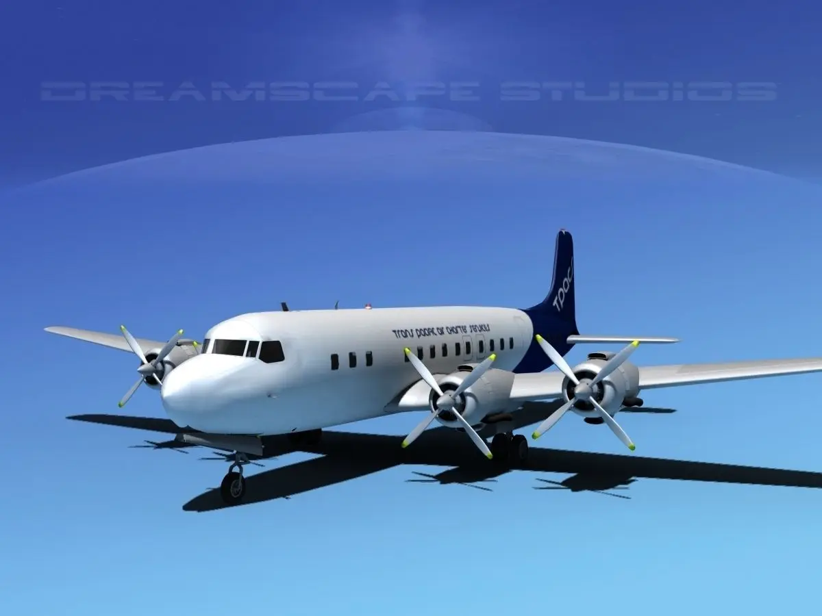Douglas DC-7C was built near to scale by actual dimensions and in some good detail. Control surfaces are animateable including flaps, ailerons, elevators and rudder. Landing gear, landing gear doors and propellers are also animateable. A full double row radial engine is modeled in the cowlings and animateable cowling flaps are also modeled. In addition this model comes in a wide variety of formats.