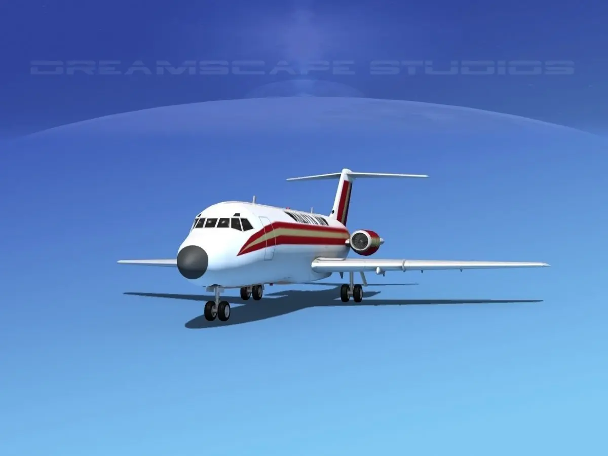 This high poly model is build very near to scale and is within a couple of percent of the actual dimensions. It has a detailed exterior including radio antennas and pitot tubes. Landing gear have been finished with a moderate amount of detail too. The model is fully textured and comes with all materials and textures. In addition this model comes with animateable ailerons, flaps, elevators, rudder, landing gear, landing gear doors and turbines. The model is available in several different formats for immediate downloading here. We are providing the DC-9-15 model in a range of liveries.